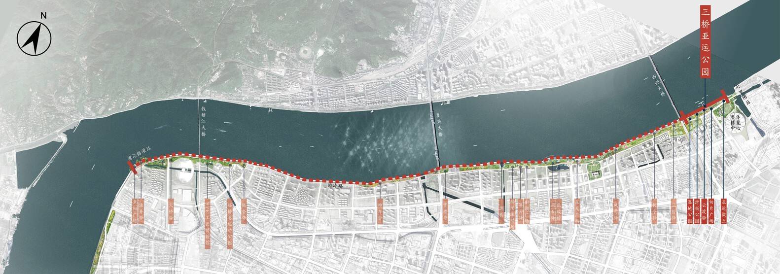 This project is a key initiative for Binjiang District in preparation for the Asian Games, deeply embodying the preparatory philosophy of "hosting a successful event and elevating a city." The overall planning concept revolves around the "Orange-Blue Ribbon, Super Seawall, and Urban Slices"—transforming from "Asian Games" to "Asian Games+" by connecting a 17.4-kilometer walled-free urban sports experience belt; from "safety" to "safety+" by constructing a new Binjiang super seawall integrating multiple functions and diverse activities; and from "daily life" to "daily life+" by creating a series of multi-themed urban slices that stitch together the waterfront public space and the city's hinterland.