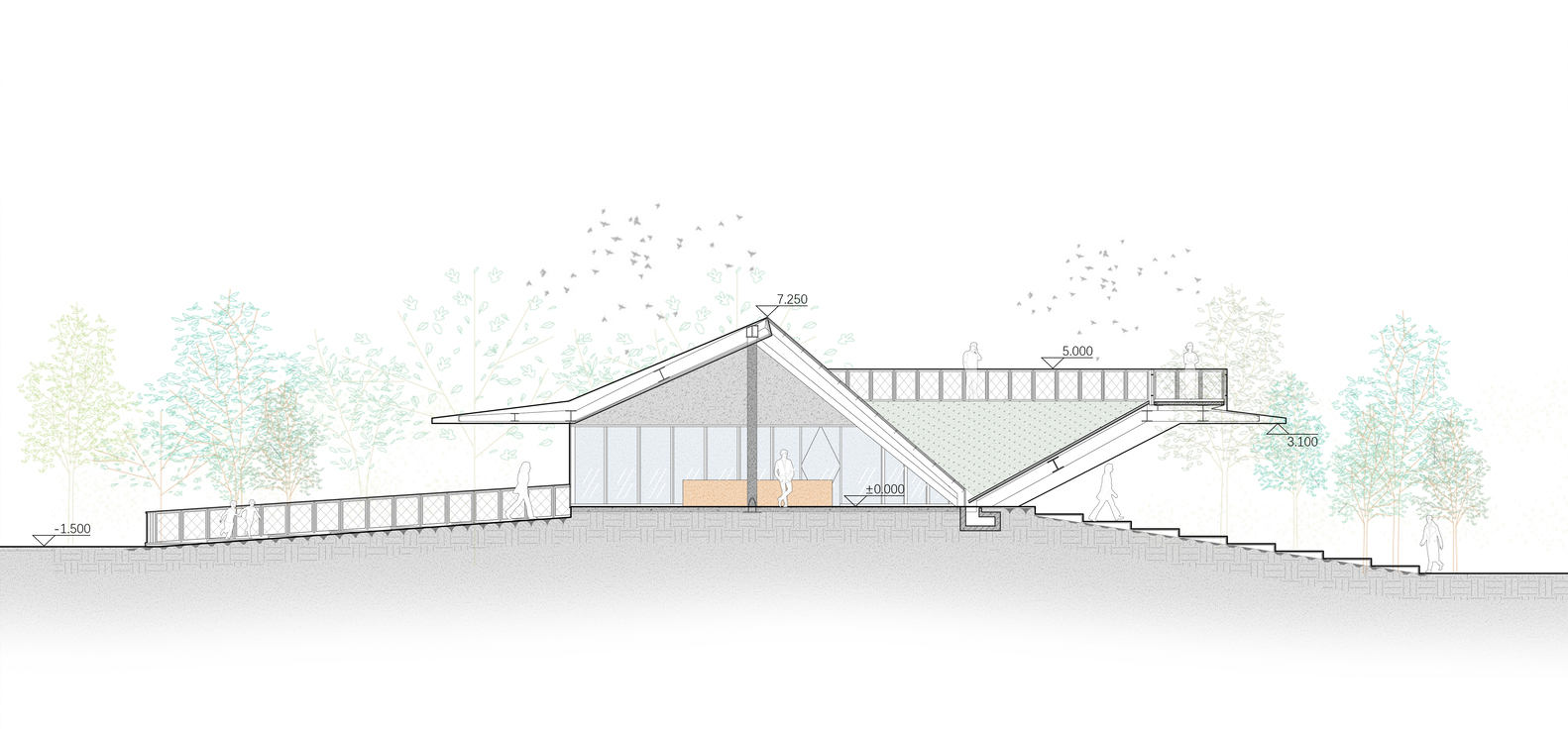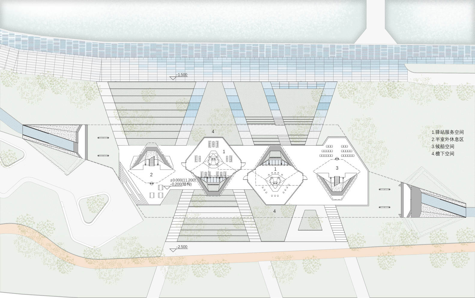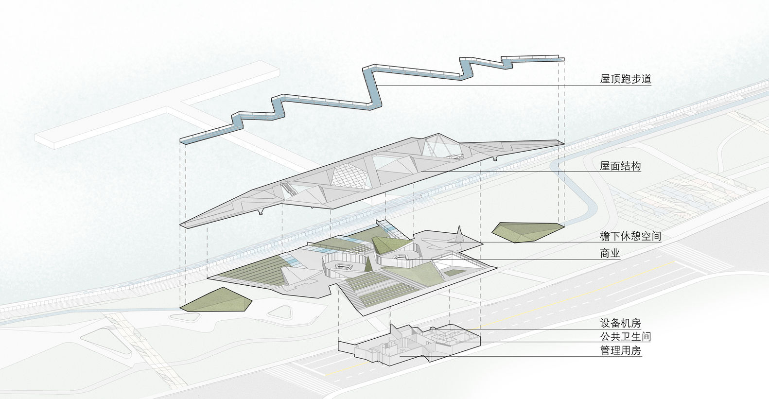 With a total building area of 1945.4 square meters, Yundu Yi is a one-story above-ground and one-story underground structure, featuring a concrete structure underground and a steel structure above ground. It measures 104m in length, 30m in width, and 7.9m in height. The site where the station is located was originally the cruise ship Olympic Dock east of the Qianjiang Third Bridge. With the upcoming Hangzhou Asian Games, Yundu Yi shoulders the usage functions of the original dock and the urban basic service system under the new environment. Based on this, the design intervenes with an operation akin to site surgery, creating an elevated public activity roof through the upward and downward folding of the structure and form, smoothly connecting the building to the site and blurring the clear boundary in the figure-ground relationship of the city, providing more opportunities for people to meet. To realize the "floating blue path" and the sequence of ever-changing views like an unfolding scroll, auxiliary spaces such as restrooms, management offices, and equipment rooms are concealed underground. The above-ground part uses a steel structure, generally composed of four repeating diamond-shaped blocks, each supported by a pair of parallel diagonal rods and a pair of V-shaped diagonal rods to lift the roof. Through rational form-finding, the structure achieves large cantilevers while maintaining light construction dimensions, with an eave thickness of only 200mm, creating a floating and transparent architectural effect. Yundu Yi forms a continuous, interactive, and rich space through the integration of interior and exterior, near and far views, and the artificial and the natural. The hosting of the Asian Games will inject an event-specific character into Yundu Yi and the surrounding Sanqiao Asian Games Park, while functions such as gathering, resting, viewing, and sports experience during the Games will later diffuse into daily life, allowing Yundu Yi to return to an accessible "urban place," providing a stage for diverse activities.
