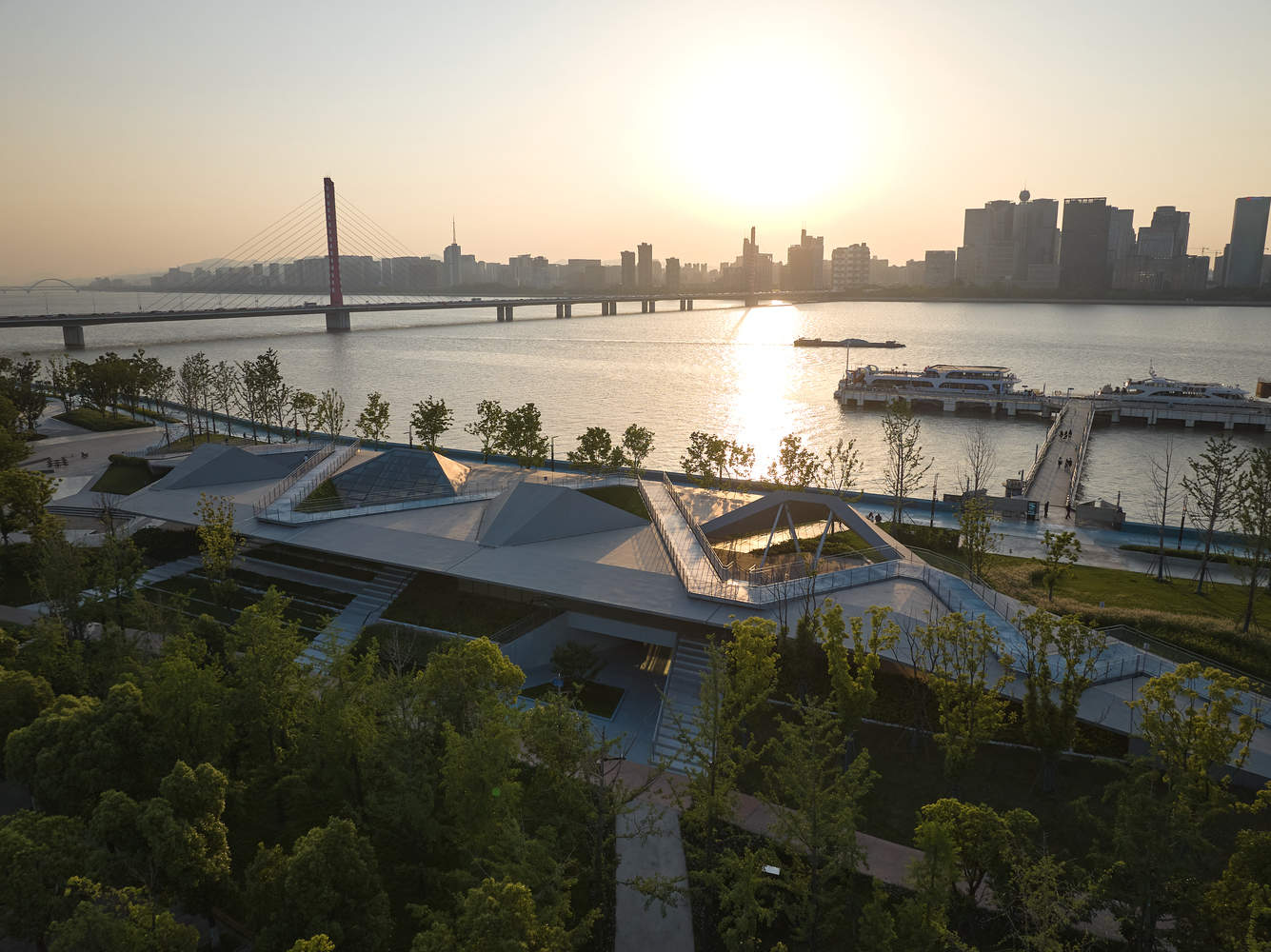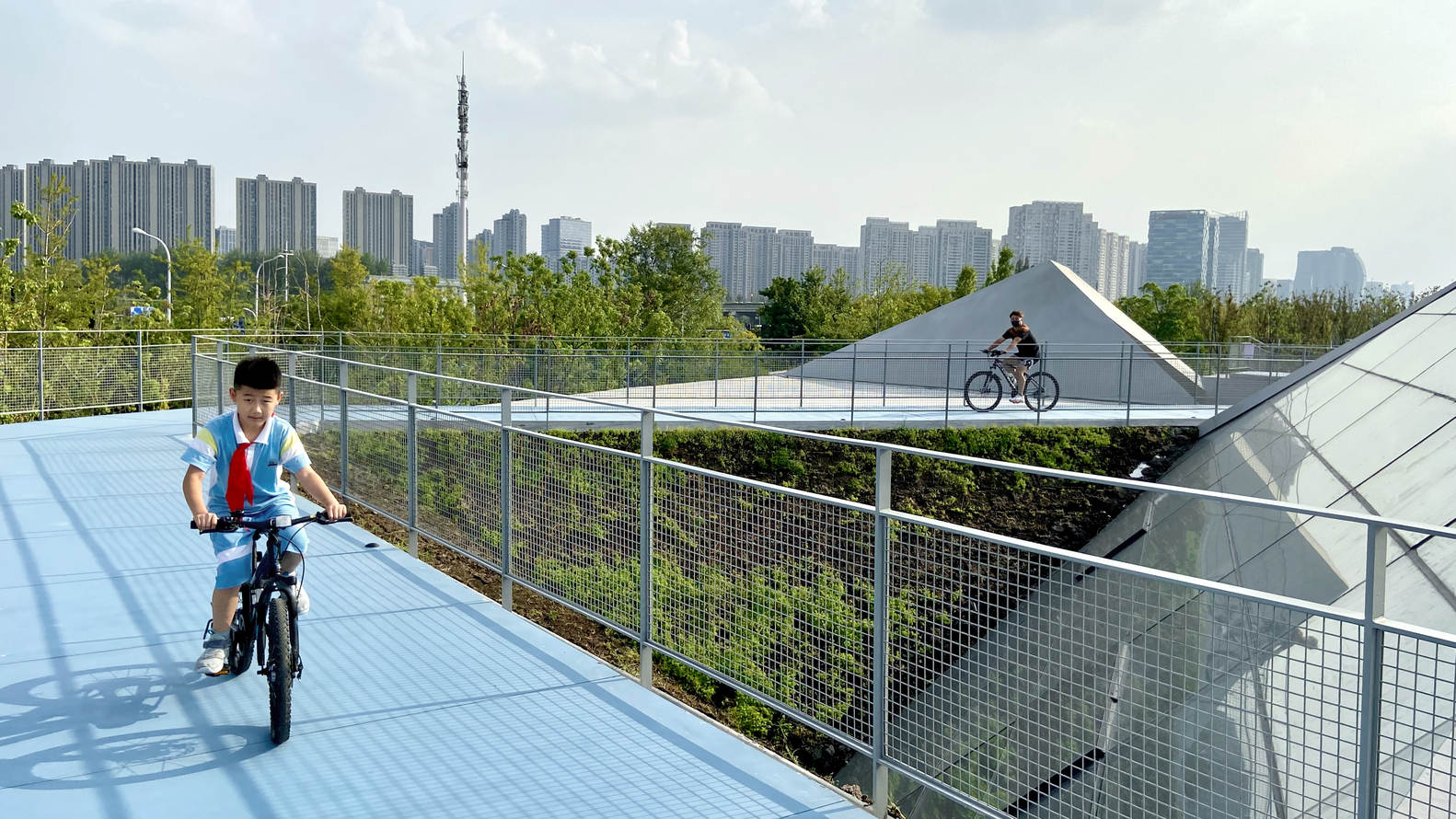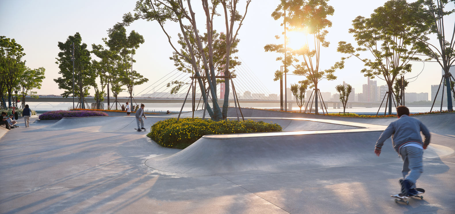 To strengthen the connection between the city's hinterland space and the waterfront public space, multiple "urban slices" are arranged on the site, facilitating the connection of greenery and pathways. Landscape elements such as tree pits, rest pavilions, display walls, and sports equipment, derived from the evolution of wave forms, share a unified design language, creating unique channels leading to the river, combined with tree species designed on both sides. As the northern starting point of Hangzhou's Binjiang public space, the Sanqiao Asian Games Park includes nodes such as a skateboard park, a wetland park, Yundu Yi, and the Asian Games Mounds. Recently, the "Binjiang Section of Zhijiang Greenway in Binjiang District" was selected as the "Most Beautiful Greenway in Hangzhou in 2023" through on-site verification and comprehensive evaluation by the coordination group for the promotion of greenway construction in Hangzhou.