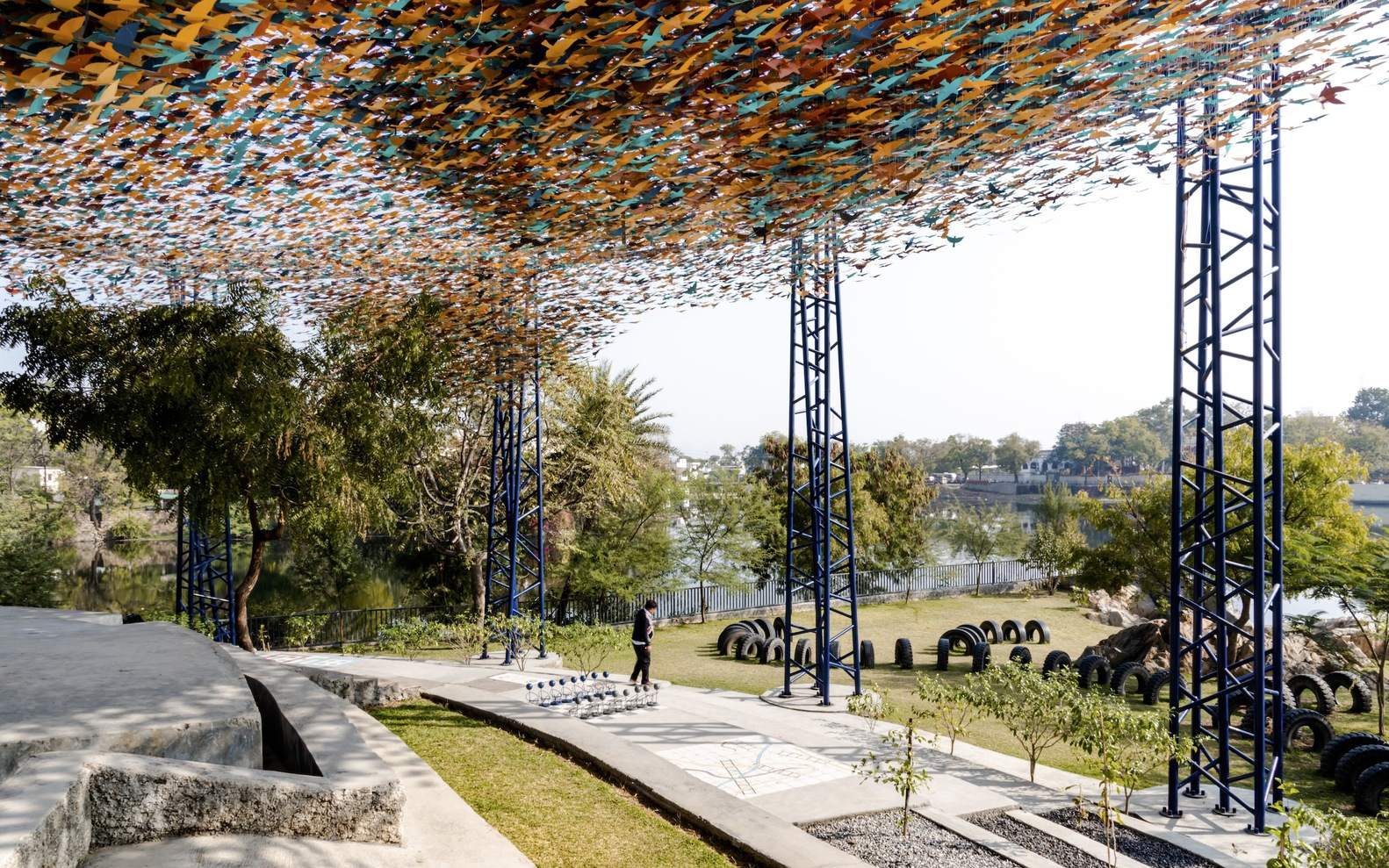 Udaan Park now features locally planted native flora, an accessible maze composed of flowering plants, medicinal herbs, and small trees, and a children’s playground constructed from locally recycled and reused materials. The centrepiece of the site is an engaging sun-shading canopy inspired by the spectacular starling murmuration often seen in the region. Supported by a tree truss structure, a canopy of 34,000 lifelike birds made from recycled plastic forms an engaging focal point while providing shade over the seating and play areas below.