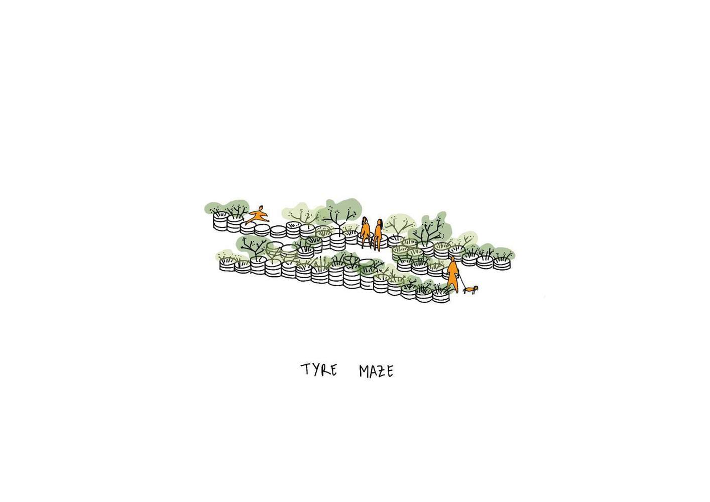 在地智慧与可持续再利用的典范:项目在设计策略上深度扎根于拉贾斯坦邦的地域性,巧妙利用了现场的自然地形和基岩构造,实现了景观的有机融合。更令人称道的是其极致的可持续性实践,通过对现有材料的创造性再利用,开创了城市更新的范例。回收的轮胎被巧妙地转化为花盆、游乐设施和迷宫;回收的纱丽织物用于秋千绳索;非结构性金属制品也由回收钢筋制成。这种“从废弃物中创造价值”的设计哲学,有力地回应了城市绿地资源匮乏的挑战。