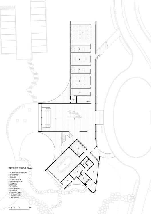 Located within the park environment, the building features large window openings in the main exhibition hall, conference, and office spaces, allowing ecological landscapes and natural light to permeate the interior to the greatest extent possible. Communication spaces that interact with the external landscape, such as entrance vestibules, stairwells, and semi-outdoor courtyards, are formed between the diagonally intersecting different structural units.