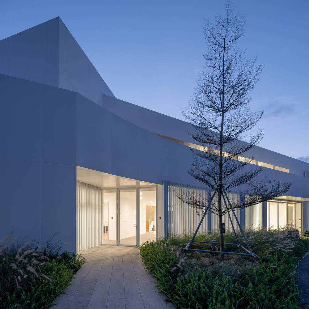 白色铝制格栅在斜45°交错的方形体量之间依序排列形成弧形轮廓,通过变角度截面完成从实体向虚体的渐变转换。这层光影表皮将在白日成为树影的画布,而在夜晚允许室内光线外透而形成光之帷幕。