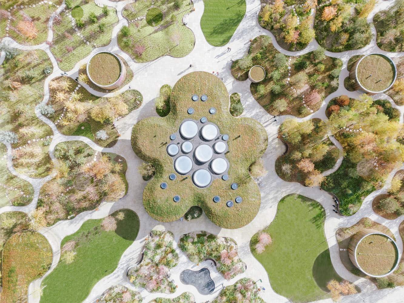 An oasis all year round, a stage for all kinds of life. The park is designed to be a public attraction open all year, planted with 628 trees, 80,000 perennial herbs and shrubs, and 40,000 bulbs from all over the world. In total, 223 unique exotic and native species provide visitors with a vibrant, ever-changing backdrop. The appearance, scent, color, and density of the vegetation change with the seasons. Spring bursts with colorful blossoms, summer is lush and green, autumn sees shades of red and yellow, and in winter, pines remain evergreen, and ponds freeze over. The variety in plant size and species offers abundant food and habitat for birds and insects.