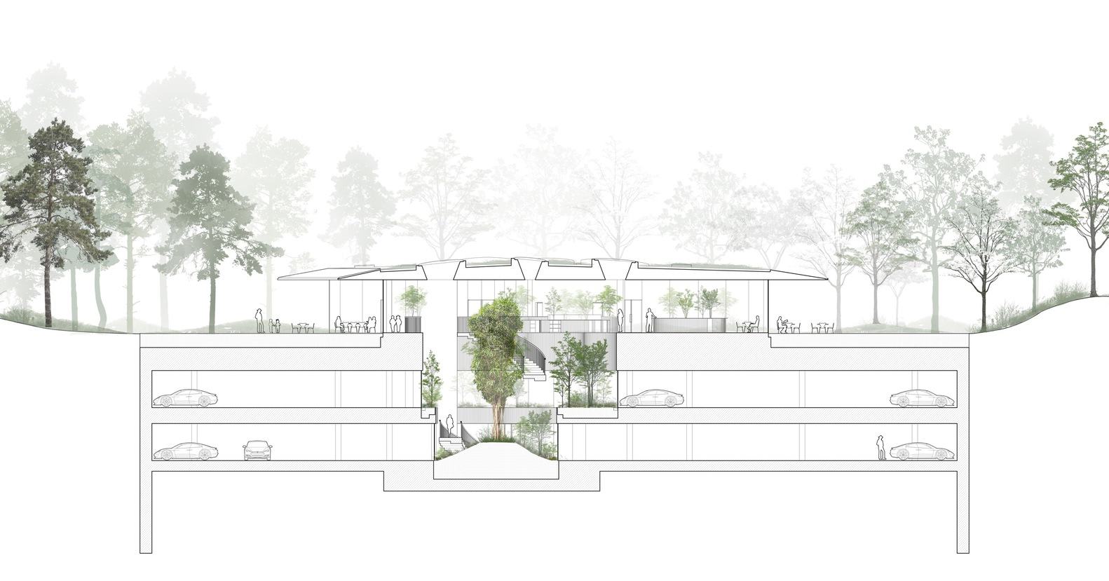 Central Greenhouse. In addition to the gardens, the park features a central greenhouse with a café, which provides access to the parking lot beneath the park grounds. Designed as an organically shaped glass structure with a floating roof, the greenhouse aims to surprise and delight visitors as they explore the lush landscape. The greenhouse and café will ensure that Opera Park remains a vibrant tourist attraction all year round, even during the desolate Copenhagen winters when many parks are bare. Terraces inside the greenhouse extend down to the parking level, accommodating 300 cars, while the subtropical biome descends, vertically weaving the park with the underground level.