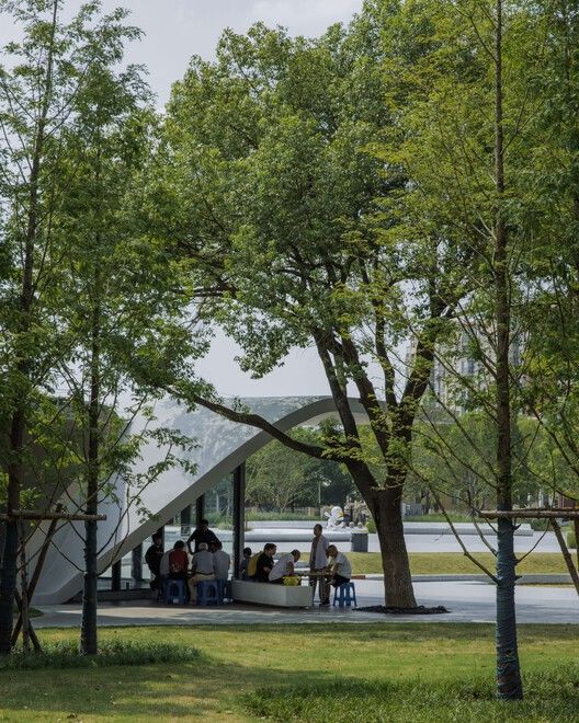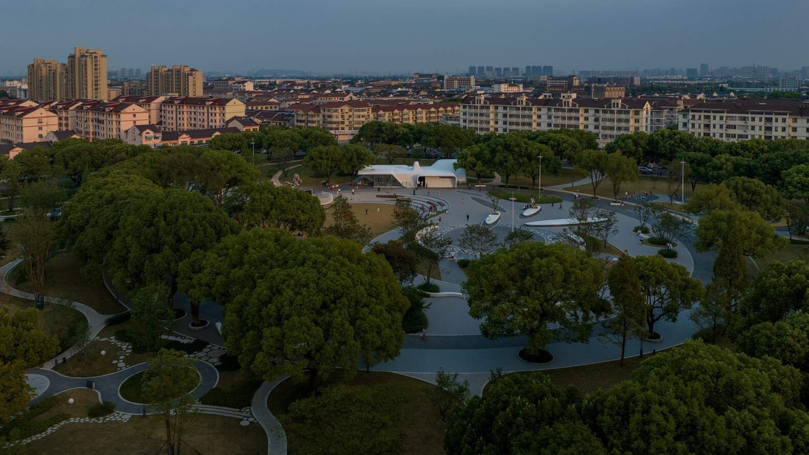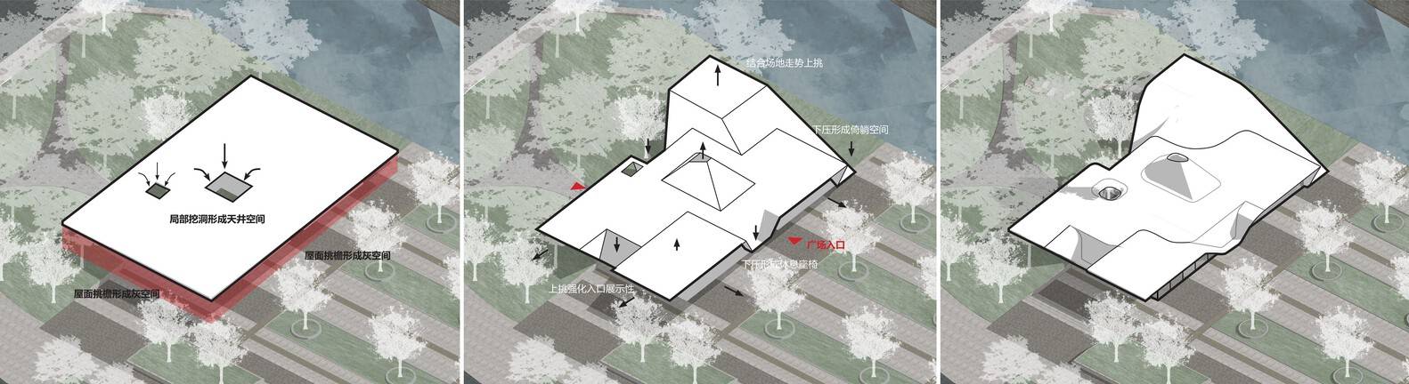 场地文脉的有机融合:本项目设计的精髓在于其对既有场地文脉的深刻理解与有机融合。建筑体量并非突兀地插入广场,而是巧妙地以两侧的香樟树树冠形态为边界,确立了其基础轮廓。这种“以景为型”的策略,使得建筑在物理和视觉上都与广场的自然肌理和谐共存,体现了对场地既有生态资源的尊重与保护,是场所精神营造的典范。