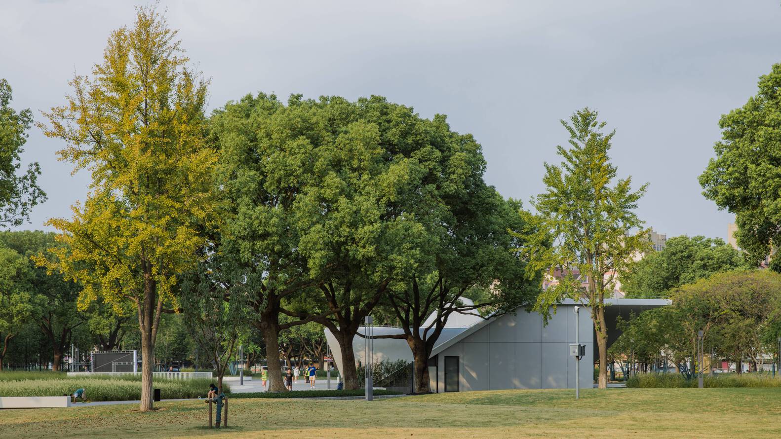 作为一个大环境中的小房子,如何使其与场地保持和谐共处的关系是设计师首先考虑的问题。建筑北侧正对广场核心下沉广场,另外三个朝向保留了许多长势良好的香樟树。城市驿站结合景观特征,以左右两侧的树为边界,依托树冠形态形成建筑的基本体量。
