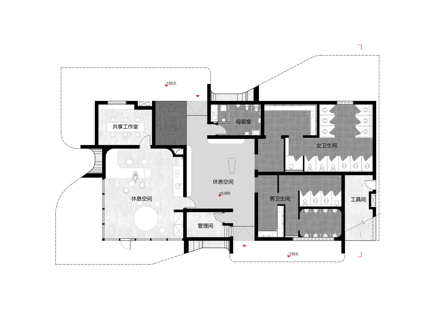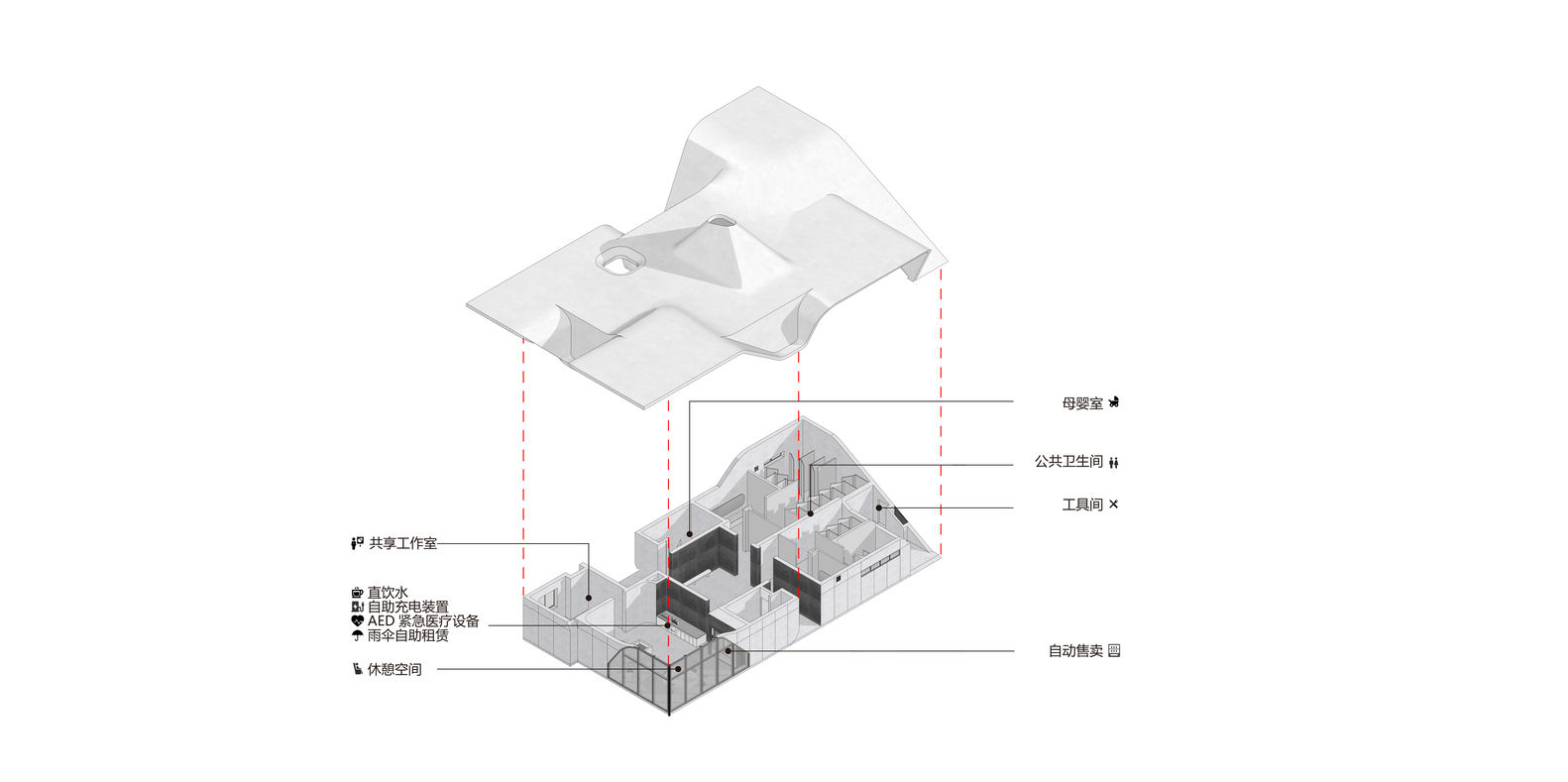 城市客厅与卫生间区域通过中庭分隔,互不干扰;中庭区域布置休闲座椅,满足人群临时驻留等候的需求;客厅面向广场中心,与景观的挑台和下沉草坪互相呼应,其内部设置休憩空间、自动售卖、直饮水、充电装置、休息座椅等;卫生间区域划分为男卫女卫和第三卫生间,男卫女卫并列设置,靠近入口区域,便于寻找;第三卫生间布置于北侧,独立出入,保证使用者的隐私安全。
