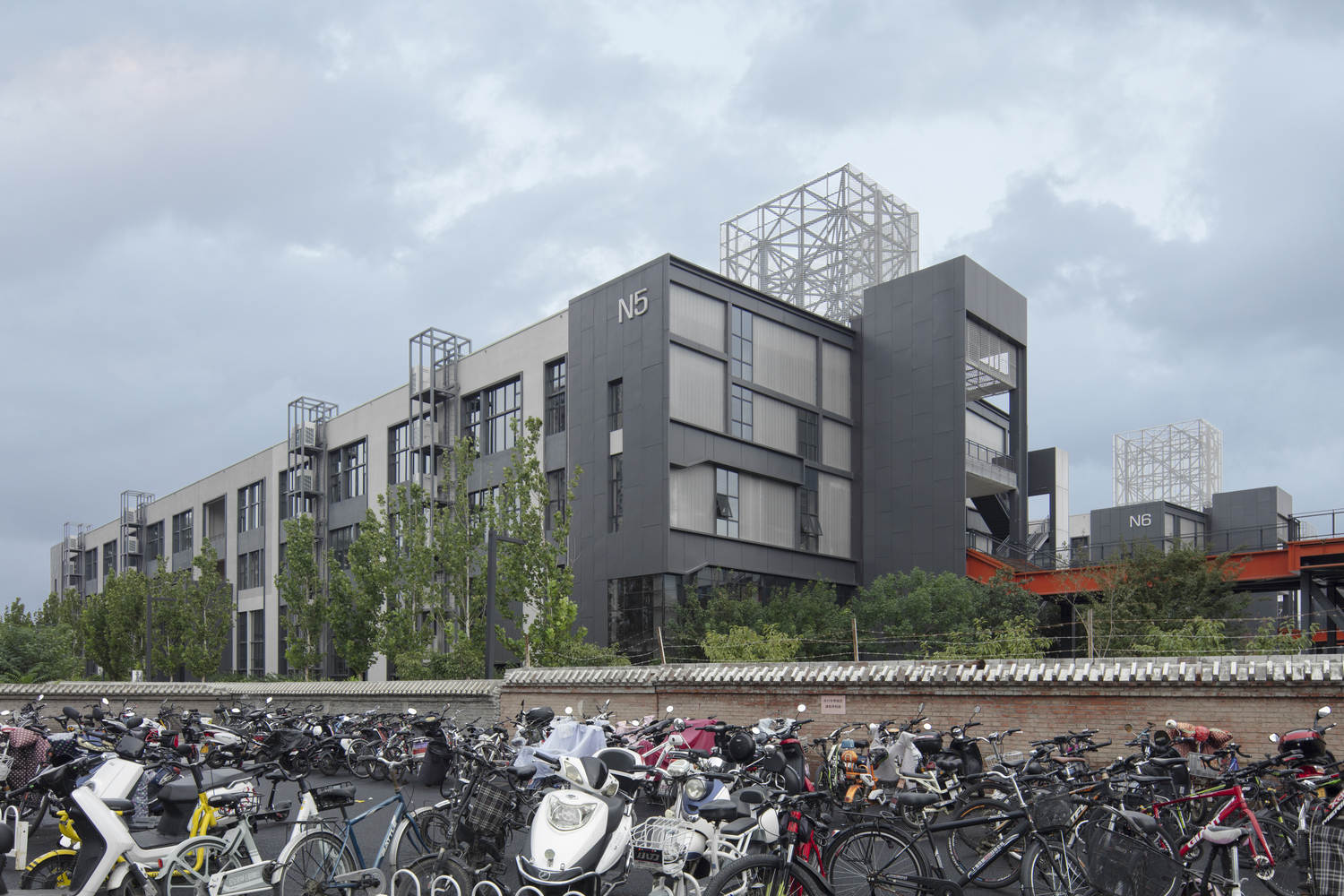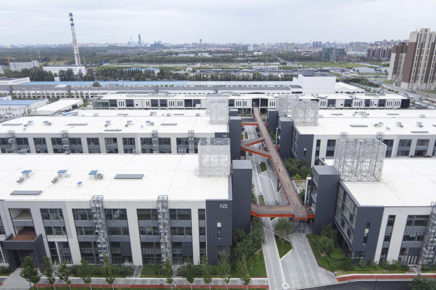 高线公园模式的本土化创新与空间渗透:通过建造高架人行道(类比纽约高线公园),设计极大地优化了12万平方米园区的流线组织和公共空间潜力。这一垂直交通网络的引入,不仅连接了分散的厂房单元,更在保留原有工业肌理的基础上,为使用者创造了多层次的、灵活可变的步行体验。这种空间策略有效打破了传统工厂布局的僵硬性,增强了建筑群落间的互动性和整体的灵活性。