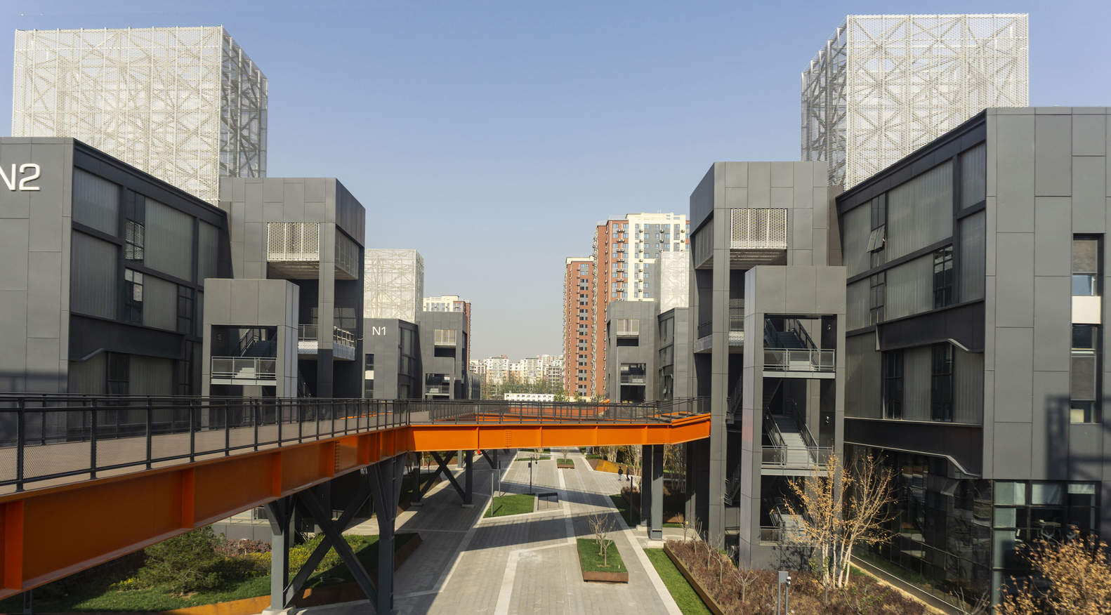 园区采用多种设计元素,巧妙营造符合高精尖产业的工业风格,展现出简约大气的空间特色。同时,园区还铺设了高架廊桥,增强了建筑群落的立体感,方便了园区内部建筑之间的连接与互动,提升了园区的外观和活力。