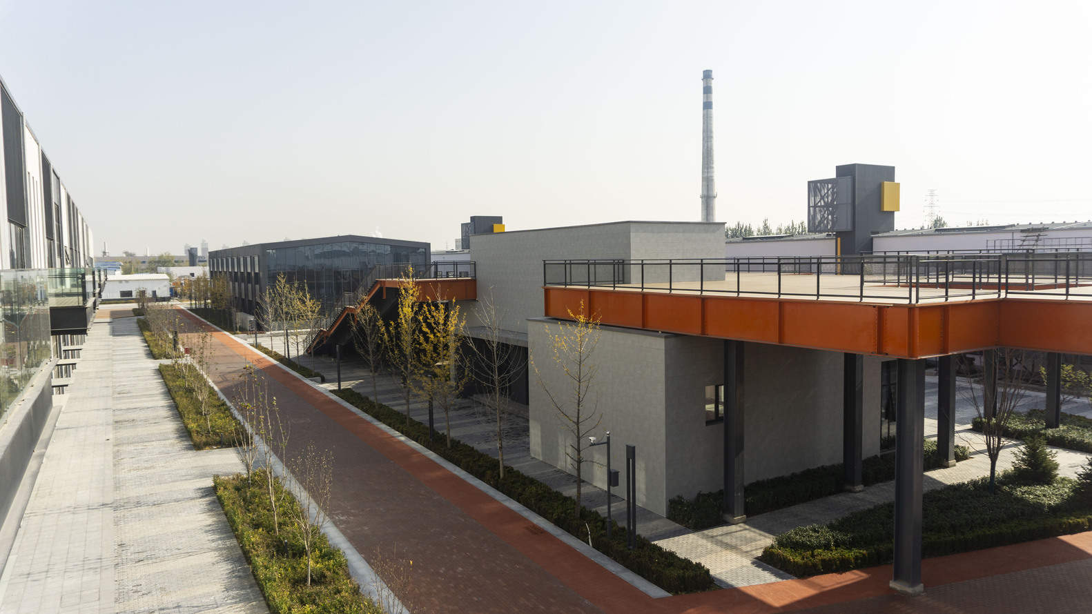 工业美学与高品质环境的营造:在设计语言上,园区巧妙地融合了符合现代高精尖产业需求的简约大气工业风格。通过对材质、体量和光影的精细控制,营造出既有历史厚重感又不失现代活力的空间氛围。高架廊桥等设计元素不仅解决了交通连接问题,更在视觉上丰富了园区的立体感和序列感,成功地将一个功能性工业场地提升为具有鲜明设计特色和高品质环境的创新生态区。