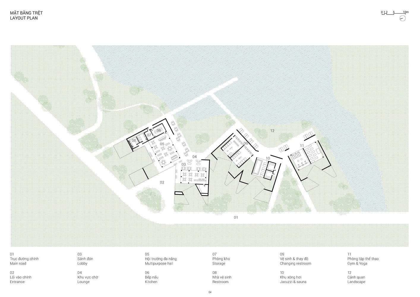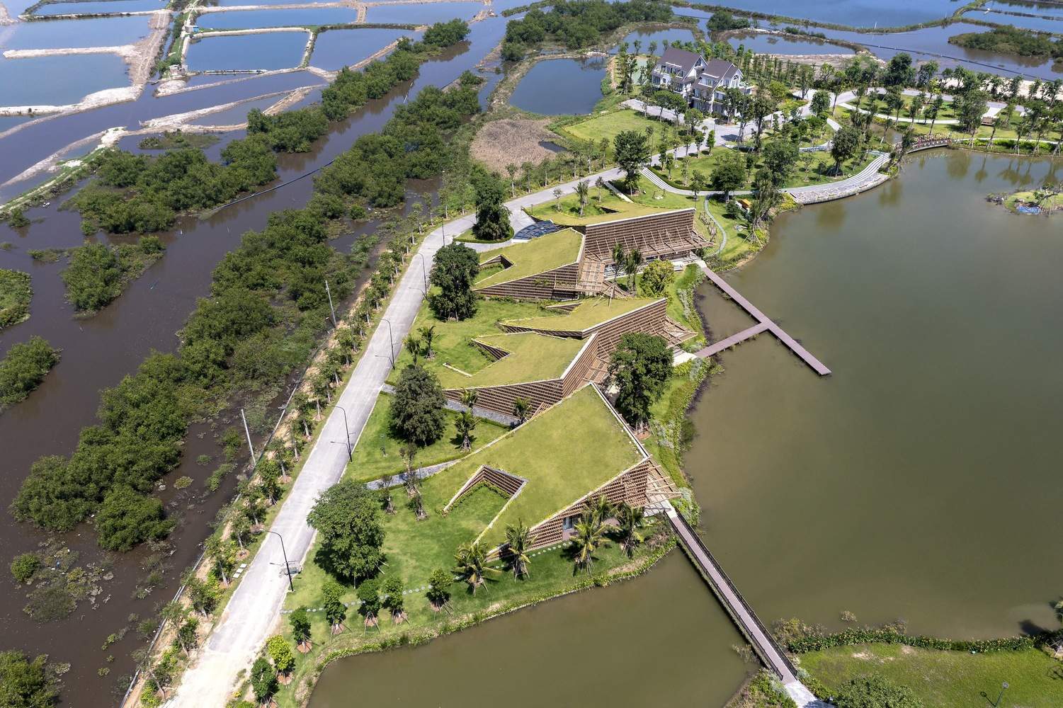 The design process drew inspiration from the existing landscape, where we cleverly extended functional zones and opened up views towards the lake. The park's layout is meticulously designed so that the architectural volumes interact subtly with each other, creating a delicate interplay. Furthermore, in designing the hillside garden, we introduced an open space at the hilltop, creating a ventilated and naturally lit environment for this tropical architectural creation.
