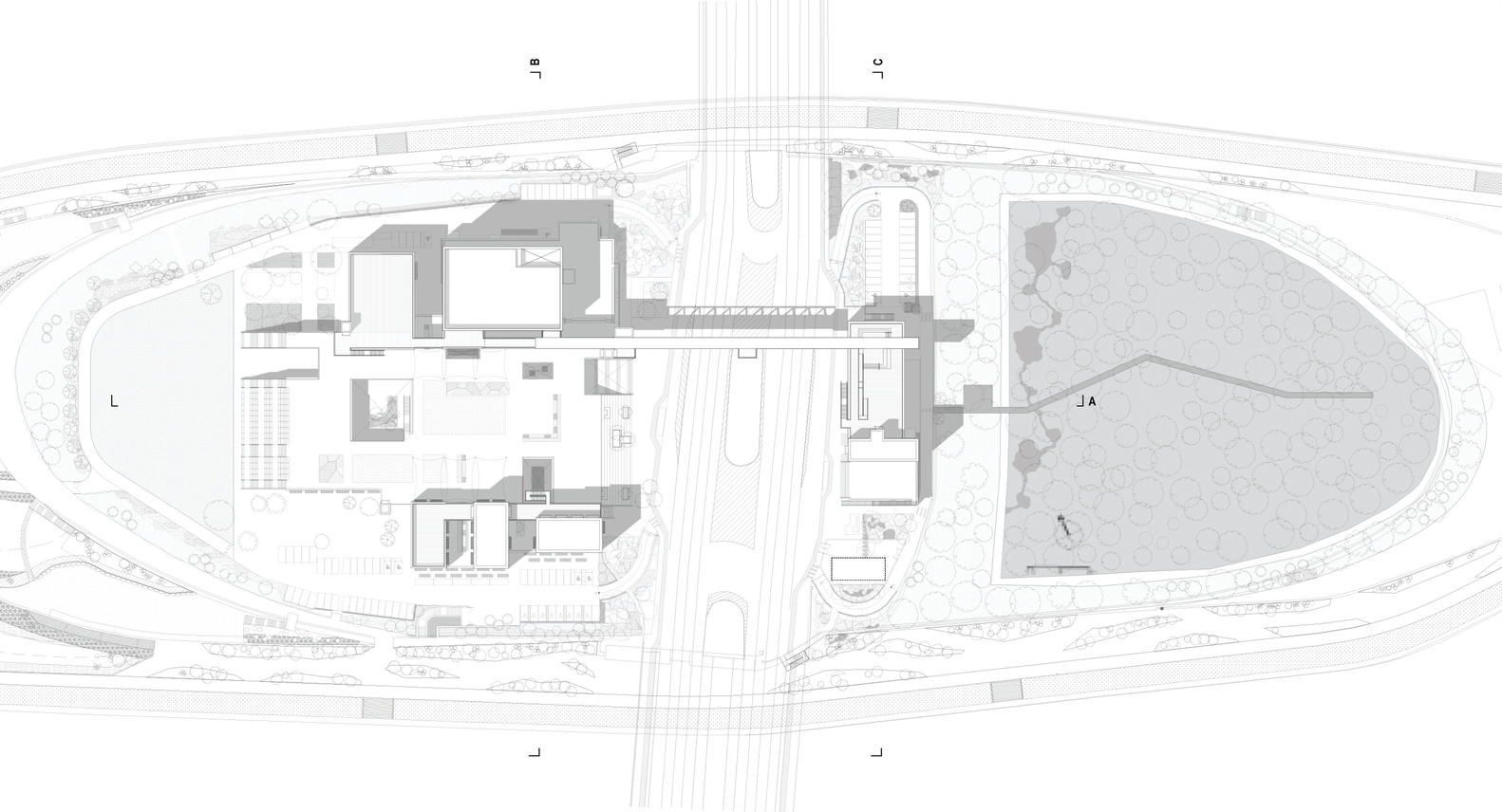 多功能垂直空间组织:设计巧妙地利用了岛屿的垂直维度,构建了两个核心层级:下层地面层集成了文化与创意设施,营造出“村庄般”的社区氛围;而上层平台则与现有大桥齐平,提供了开放的公共广场和观景视野。这种双层结构不仅最大化了岛屿的利用效率,也平衡了私密性与公共性,为不同用户群体创造了和谐共存的可能性。