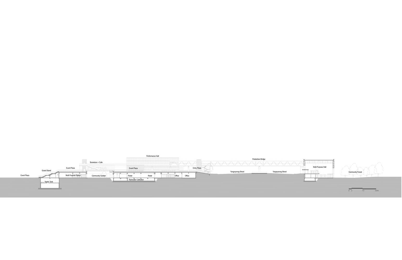 Nodeul Island is divided into two main levels: the existing ground level provides various cultural and creative venues, while the upper platform (level with the existing bridge) offers flexible public squares and viewing decks. Offices, shops, galleries, a bookstore, a multi-purpose hall, and a 450-seat theater are integrated into a village-like setting, forming a small community where different programs and user groups coexist harmoniously. The island's landscape also offers visitors a rich, park-like social experience. This new, vibrant, community-driven typology creates endless possibilities for both new and returning visitors, establishing a place full of historical depth and untapped potential.