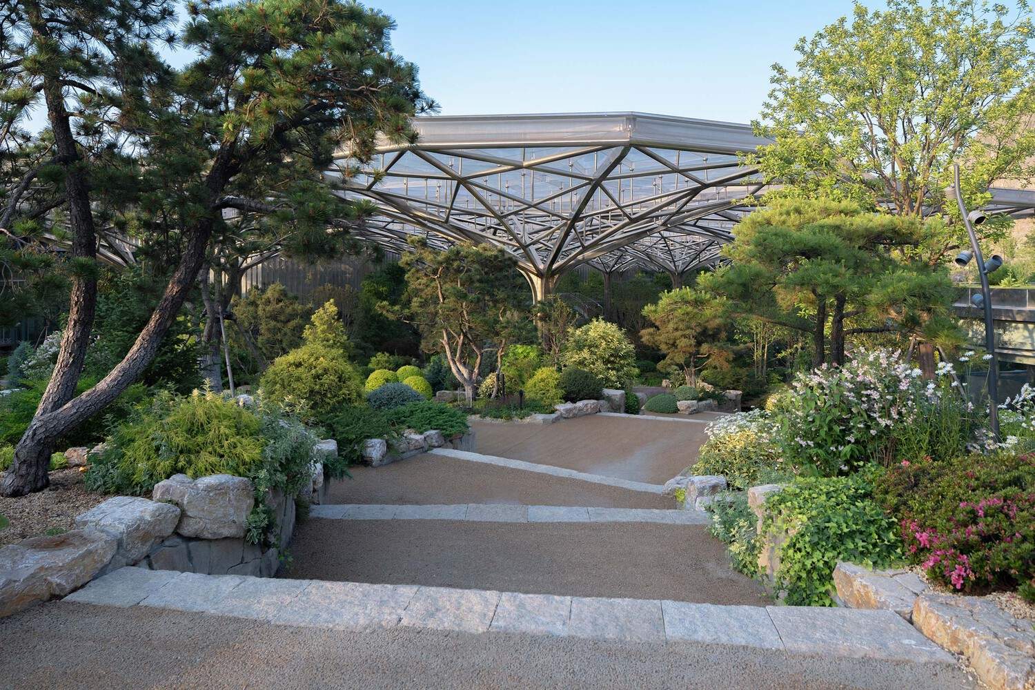 创新性的植物园结构与微气候营造:景观设计的核心亮点集中于植物园的设计,特别是其标志性的巨型透明水池屋顶,由42根不锈钢“树状结构柱”支撑,不仅创造了强烈的视觉符号,更重要的是为内部的植物生长提供了受控的光照和水分环境。设计团队基于科学分析,细致划分出旱生、中生和湿生三大生境区,并通过地貌重塑(如旱生花园的岩石台地和坡道组合、中生花园的丘陵峡谷)精准匹配植物需求。这种对“微气候”的精细化设计,实现了复杂物种在人工结构下的共存与展示,是技术与生态美学完美结合的体现。