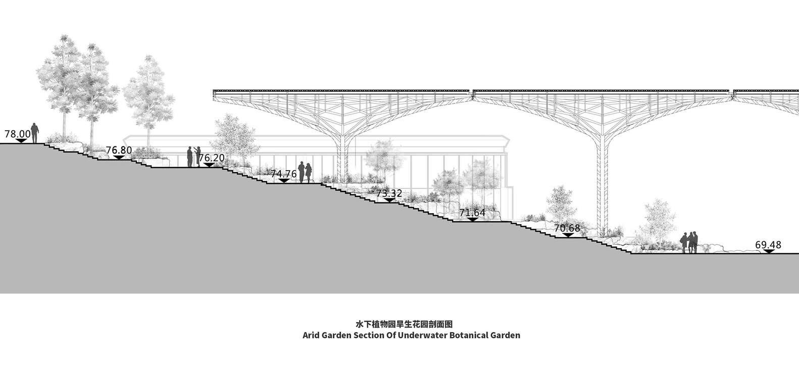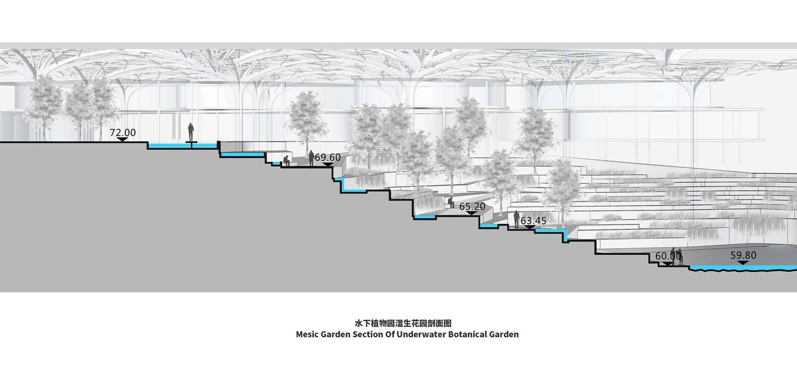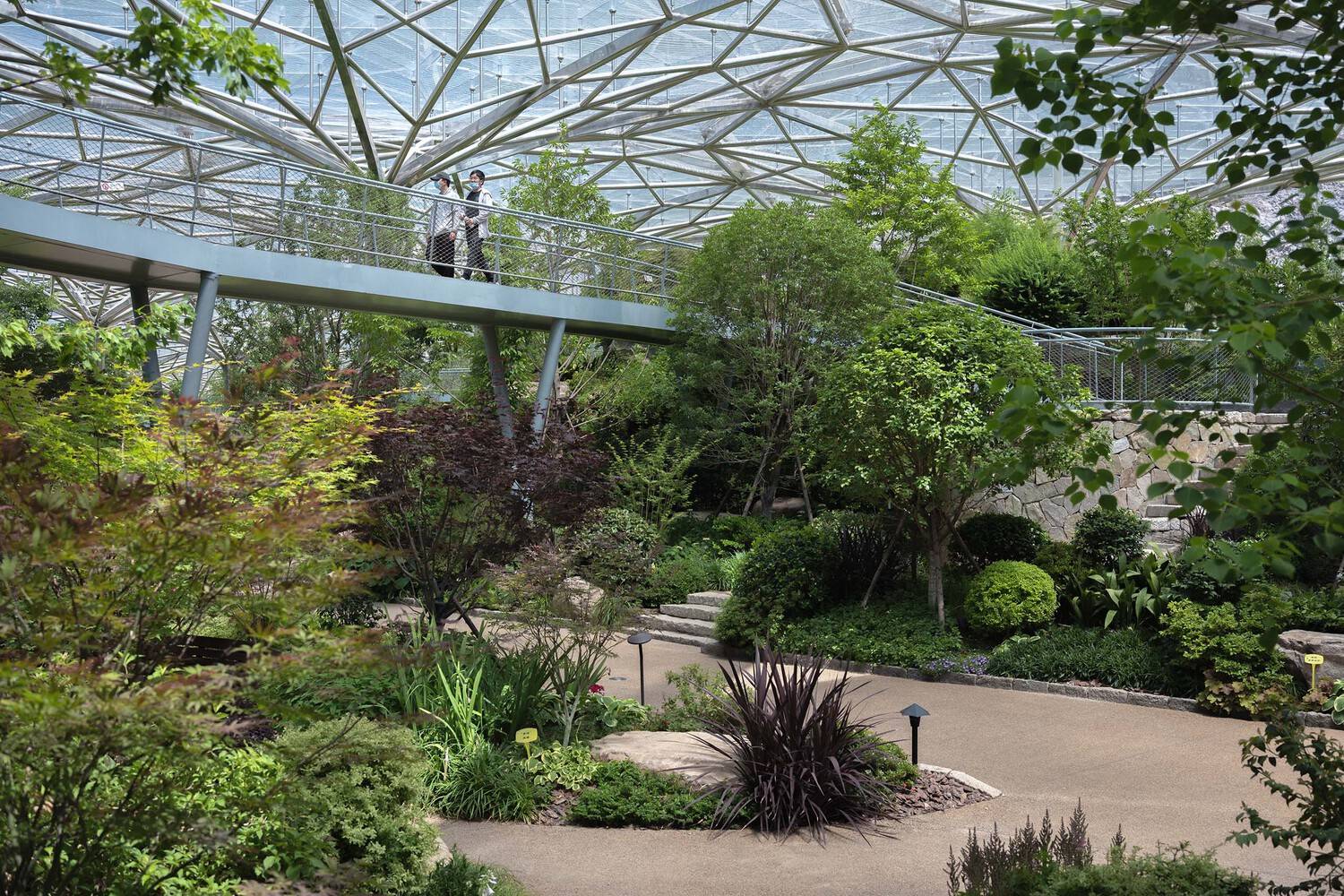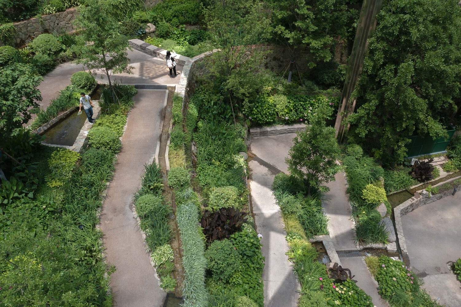 湿生花园包含种植水生植物的池塘和由层层台地和之字形坡道构成的下沉荫生植物区。