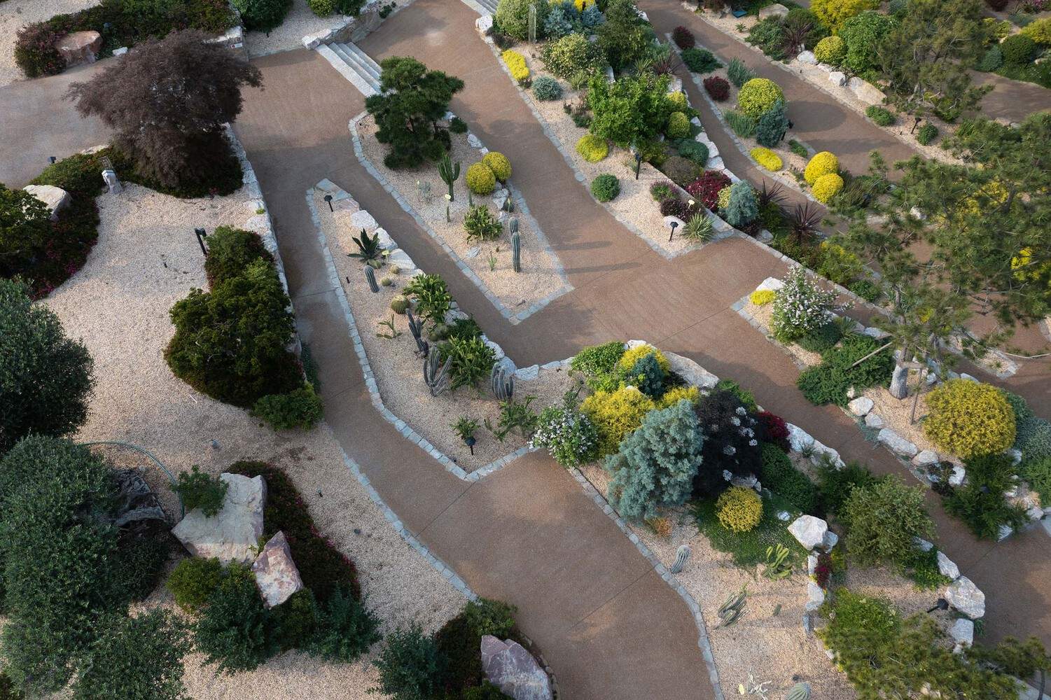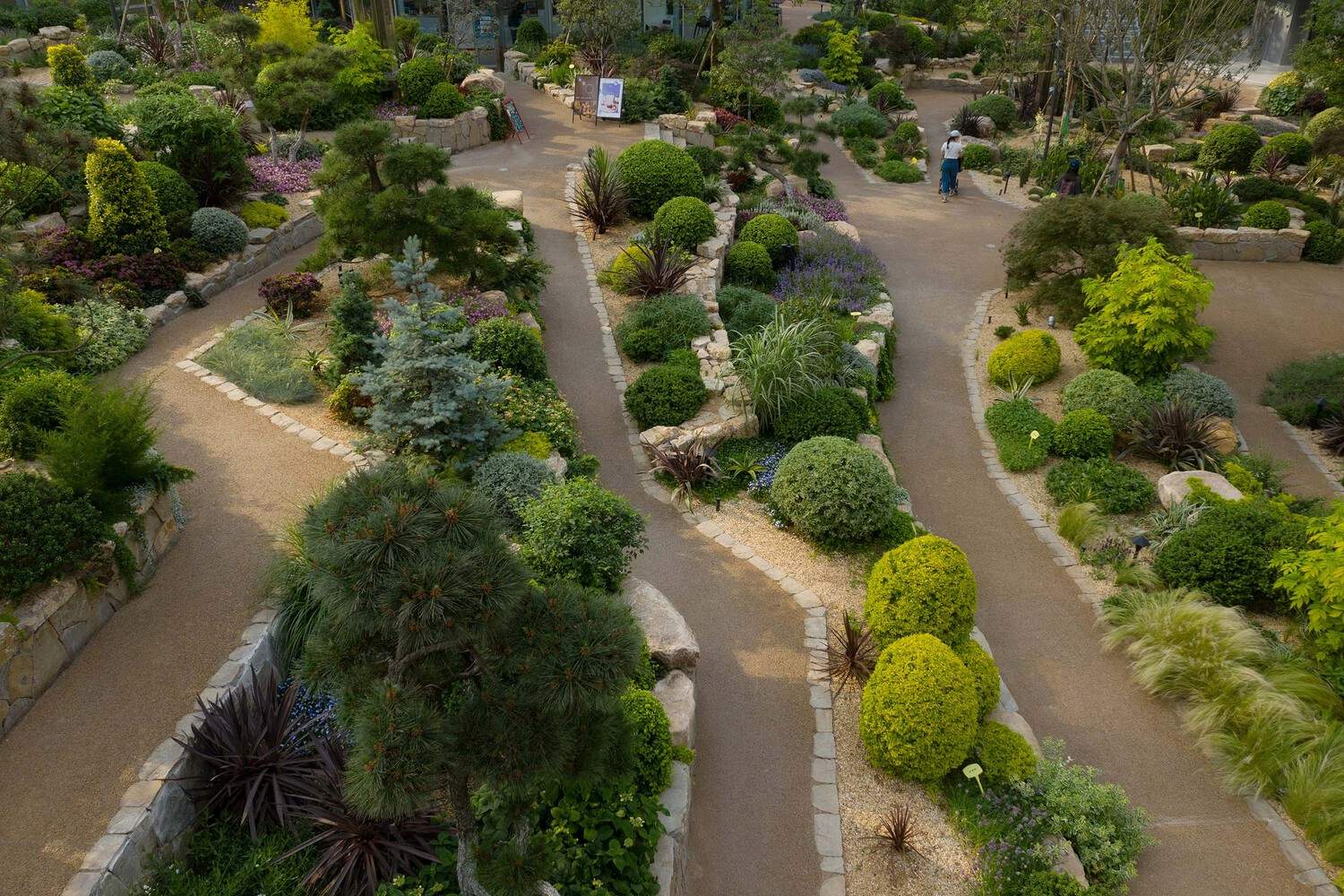 The arid garden cleverly combines 67 steps and a total length of 86m of zigzag ramps through staggered rock terraces, where drought-tolerant and nutrient-poor plants of various shapes and colors grow.