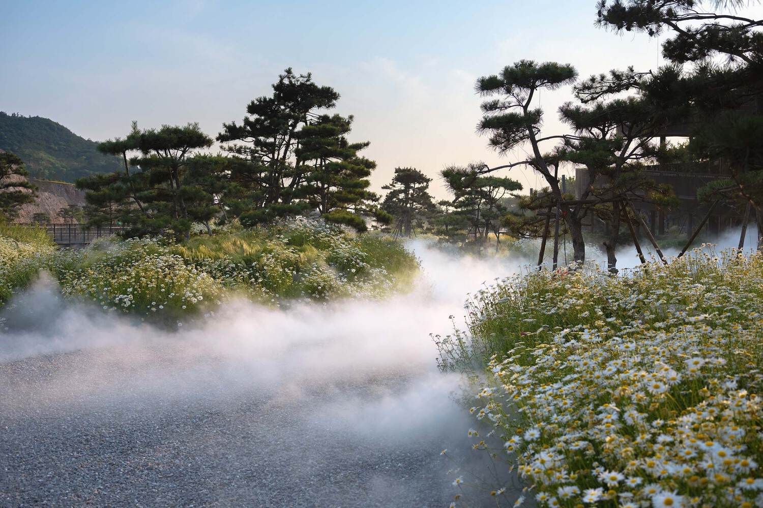 To preserve the memory of the original quarry, the Mist Garden adopted a partial restoration method, restoring vegetation only in a series of scattered island-like areas, while the gravel surface of the quarry remnants was retained in other areas.