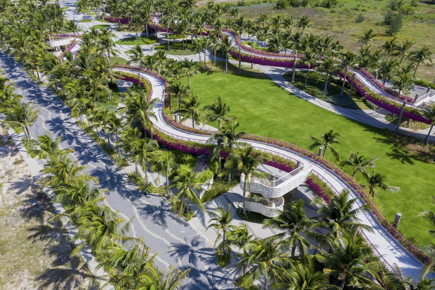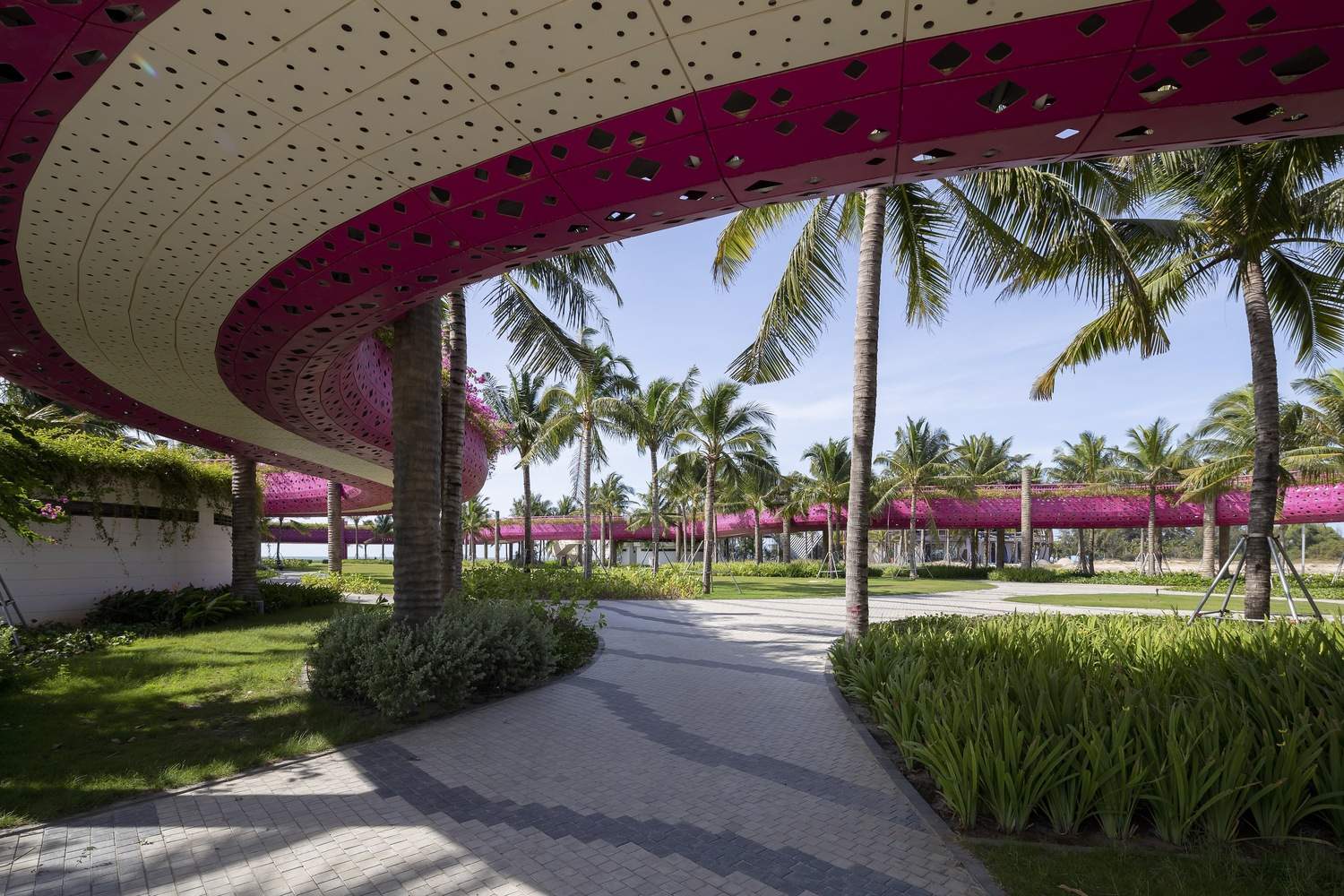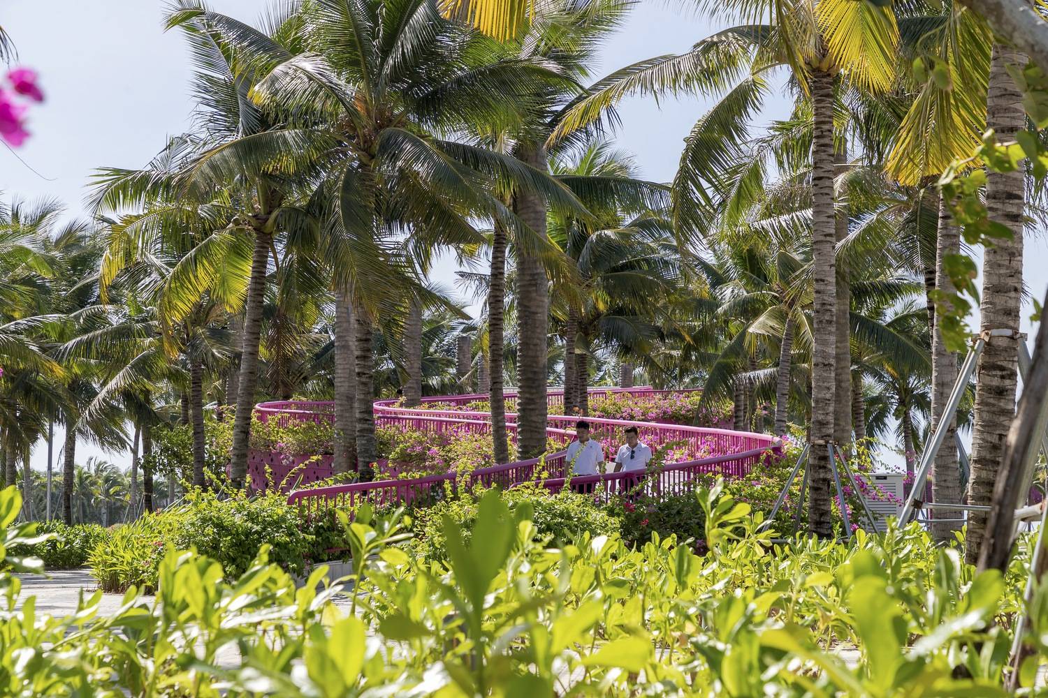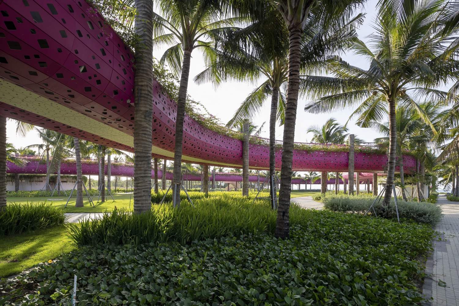 “椰树间丝带”的创新空间叙事:项目最精髓之处在于其对垂直空间和观景体验的颠覆性重构。通过“椰林间的丝带”概念,设计巧妙地利用柱状结构模拟椰树,并以火龙果色的抬高步道(丝带)穿梭于树冠之间。这种设计不仅提供了前所未有的“从上方触摸树叶”的体验,打破了传统只能在树下仰视的视角限制,更重要的是,它将场所的标志性元素——椰林——转化为了可供行走的立体景观网络,极大地丰富了游客与环境的互动层次。