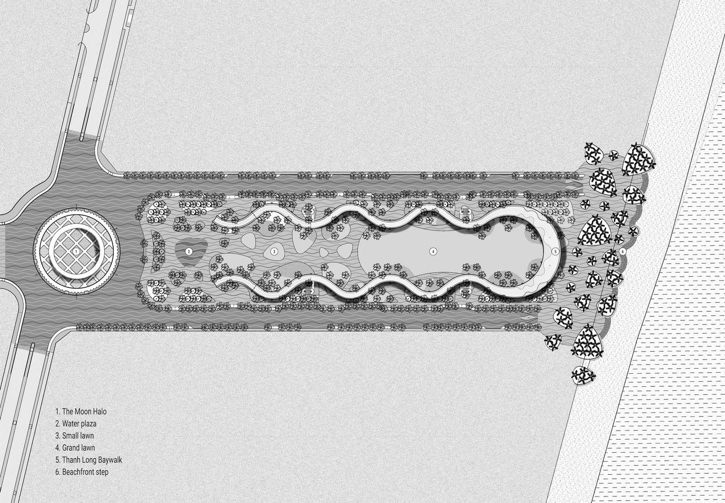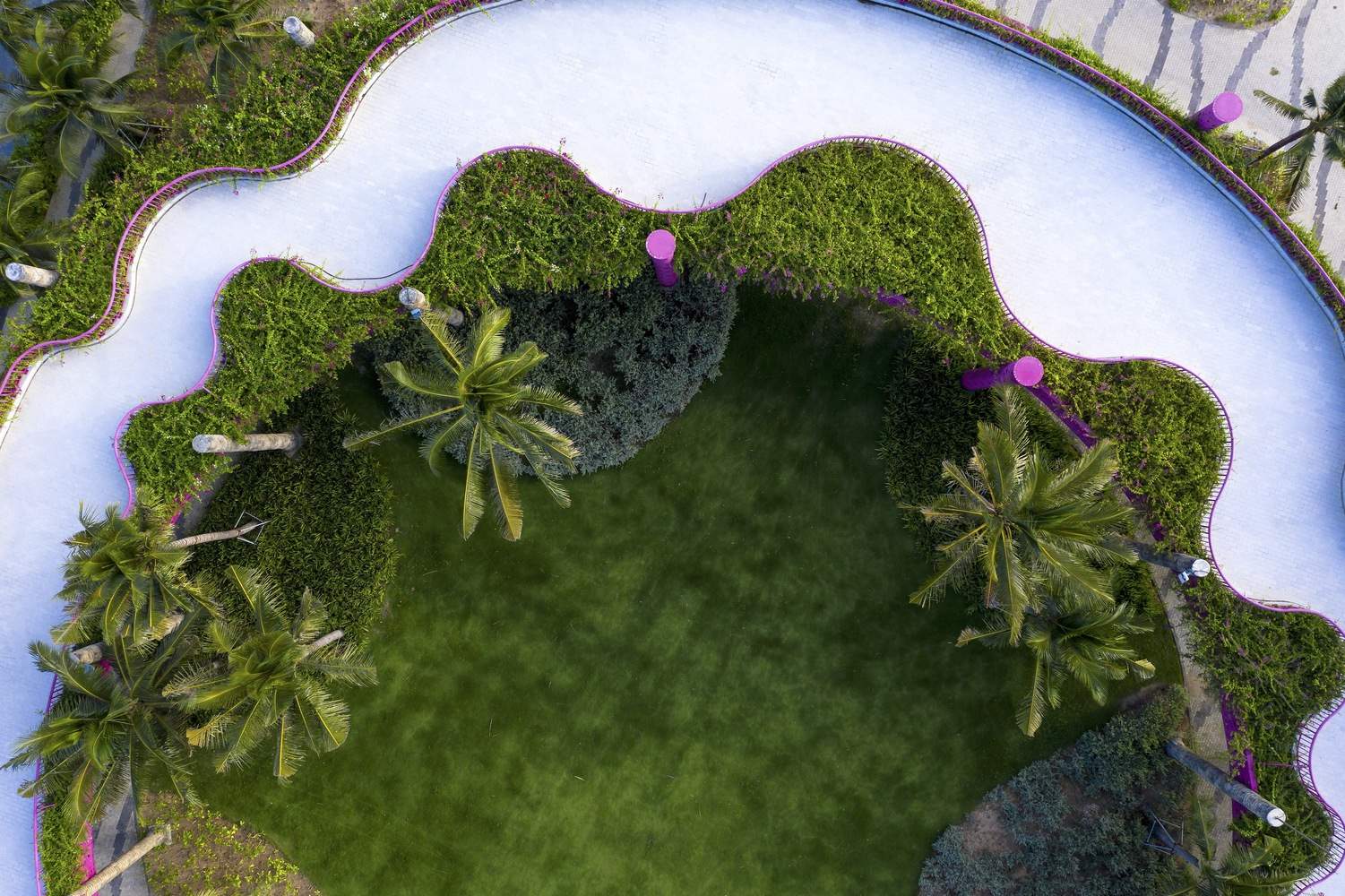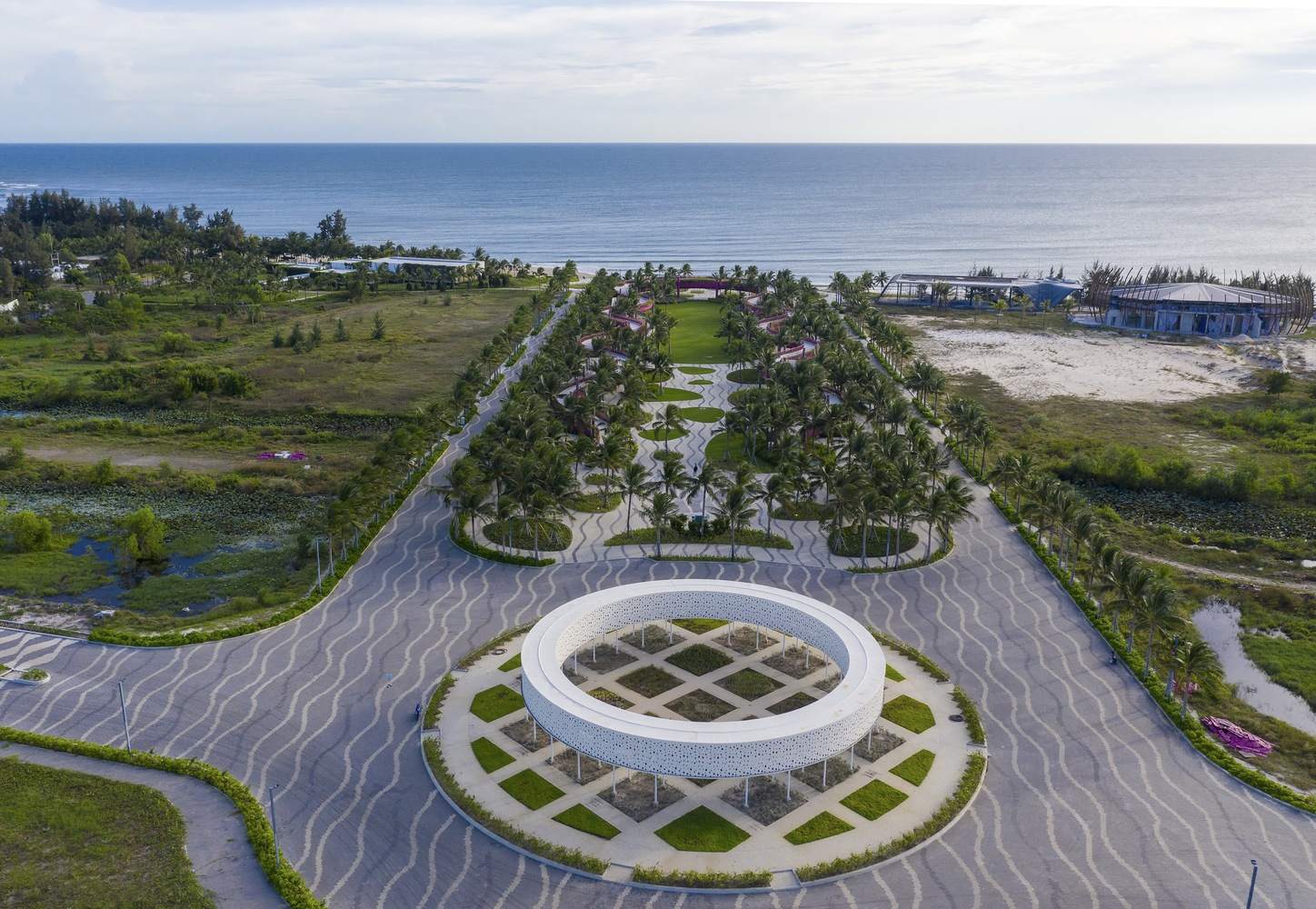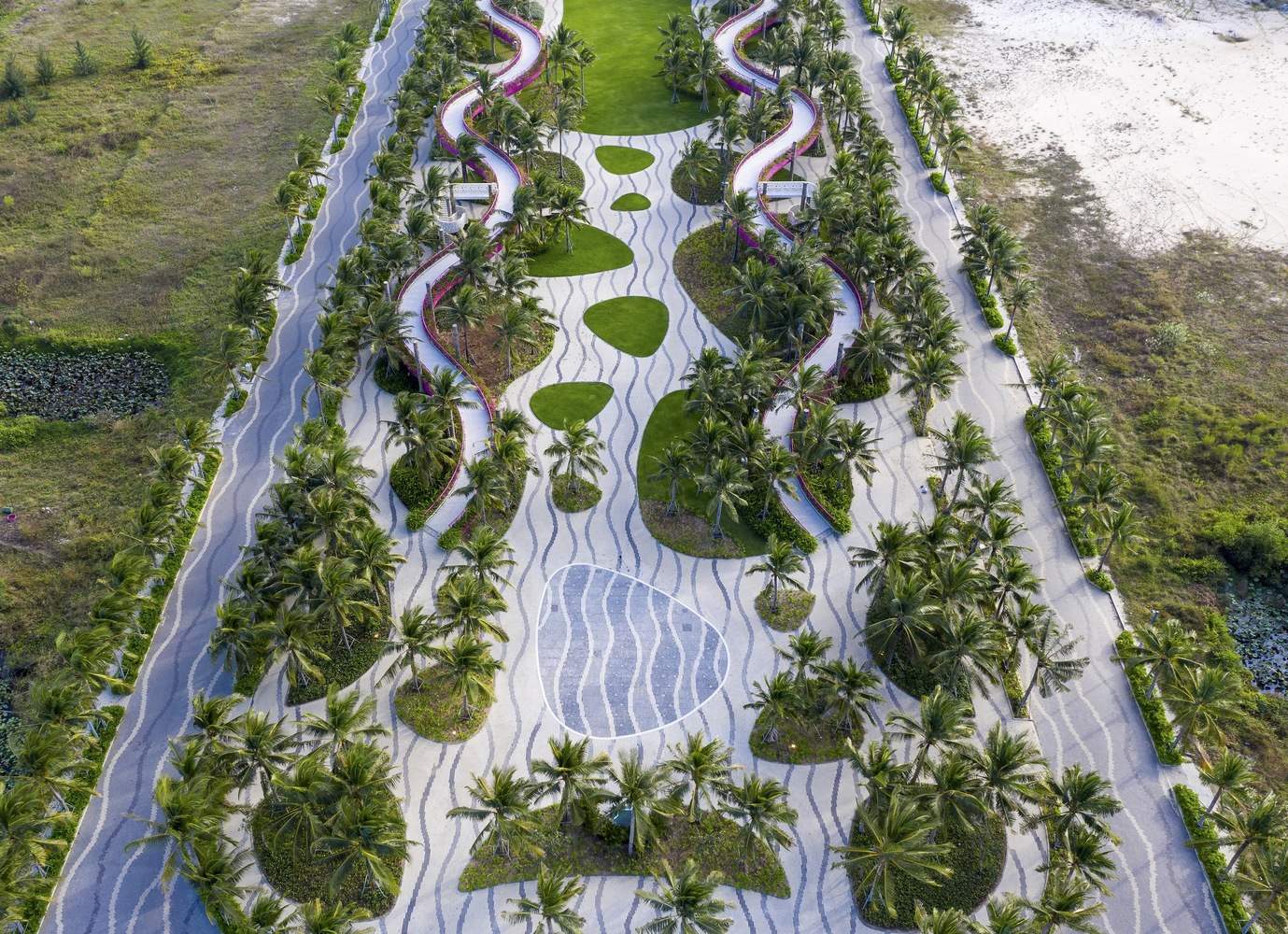 Paving is sand, and sand is paving. This is an ecological paving solution using precast self-compacting concrete bricks on natural sand, plaza ground, and roads to promote ground drainage. Artificial intervention is just a light touch on the ground surface. Vegetation is composed of three layers: groundcover, shrubs, and coconut trees, all being sun-resistant, wind-resistant, and low-maintenance native bay species. They recreate an oasis against the typical white sand background of Binh Thuan.
