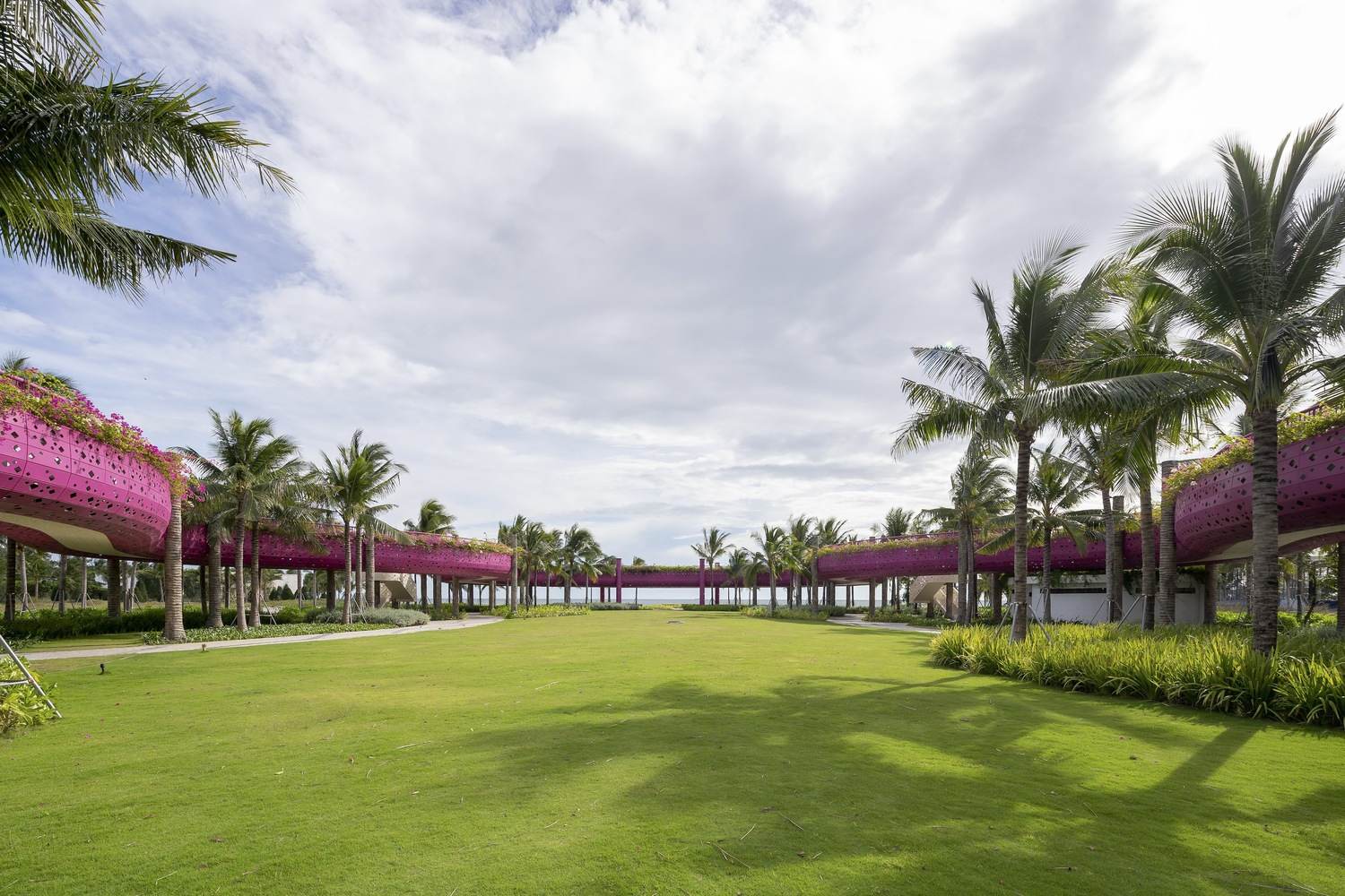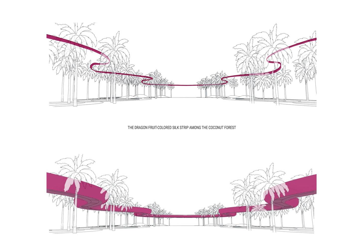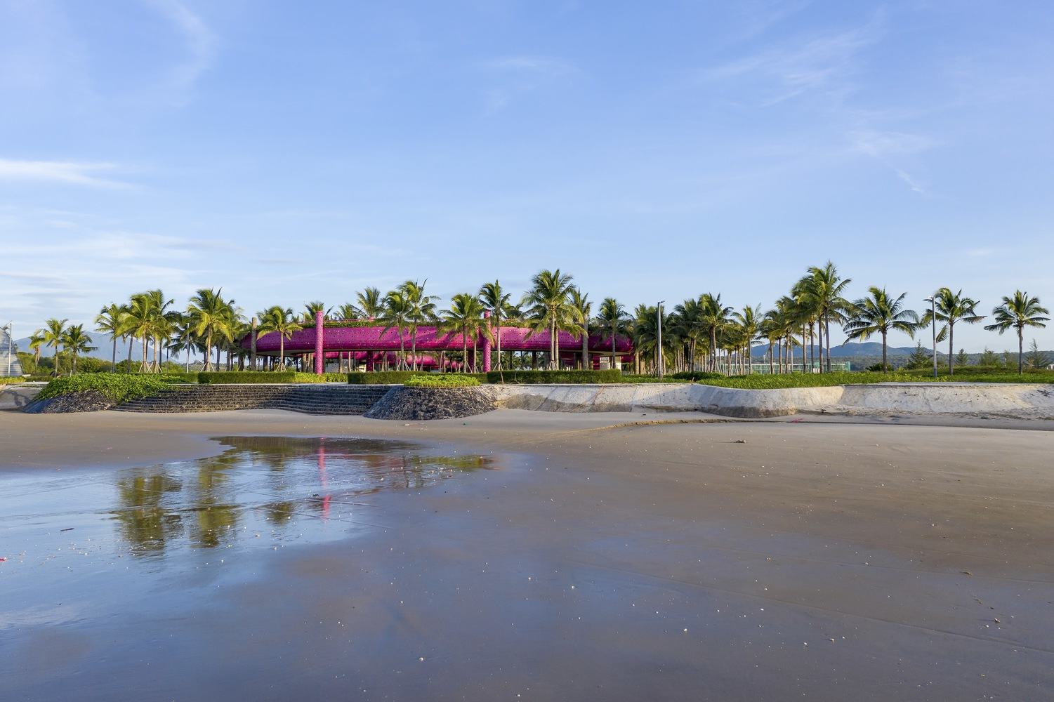 柱廊的空间围合特征结合椰树林间的火龙果色“丝带”,形成了广场。桥的构造柱形似笔直的椰树,人工树皮由纤维混凝土制成,使其与真树融为一体。桥(丝带)和柱(椰林)的叠加,强调了一种理念:火龙果色丝带是一条飘在空中的游步道,蜿蜒于椰树树冠之中,创造了一个上下体验椰树、优化海湾视野的空间。我们通常只能在椰树树冠下行走,且只有自下而上的视角。然而青龙湾廊道让你可以从上面触摸和感受椰子树叶。