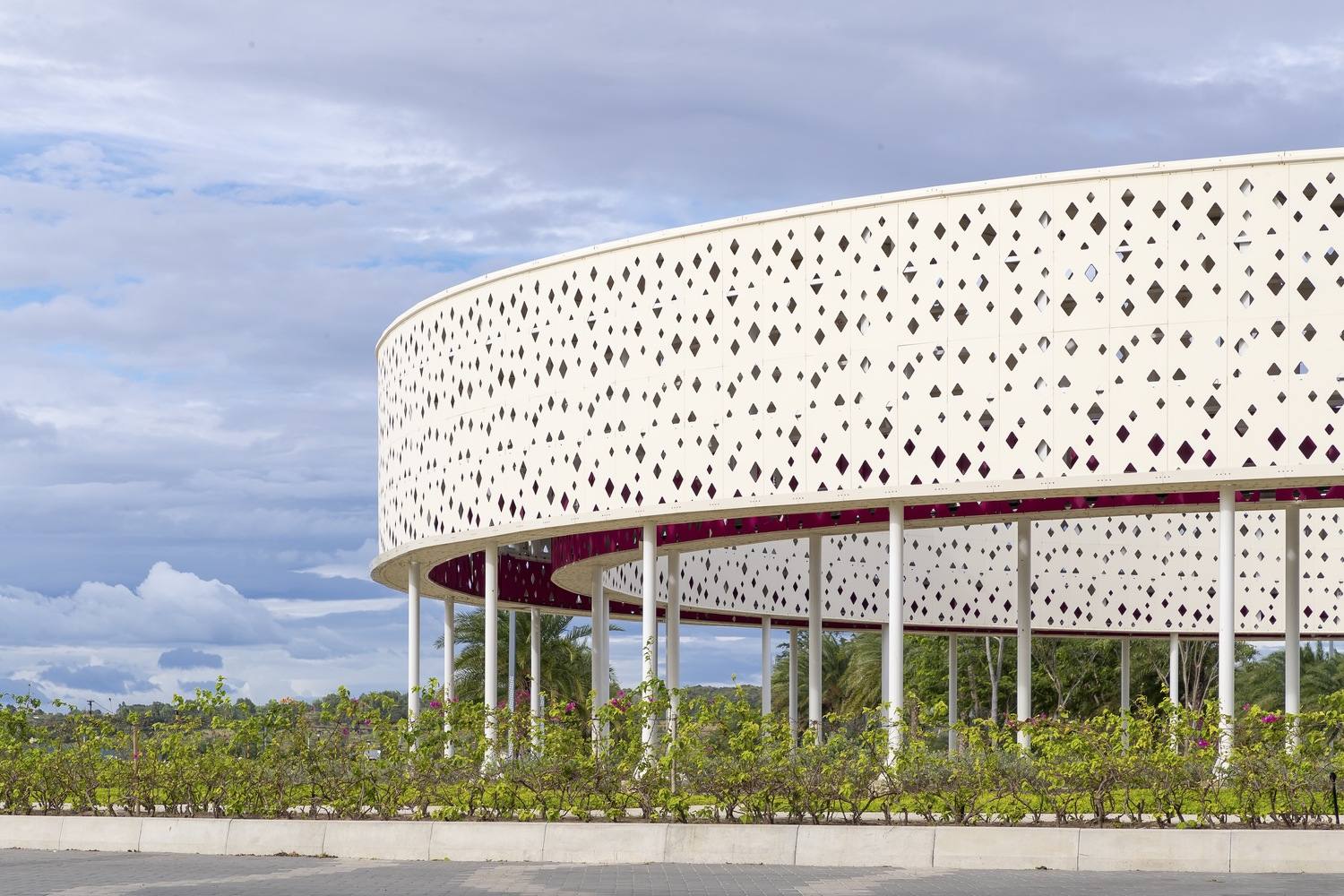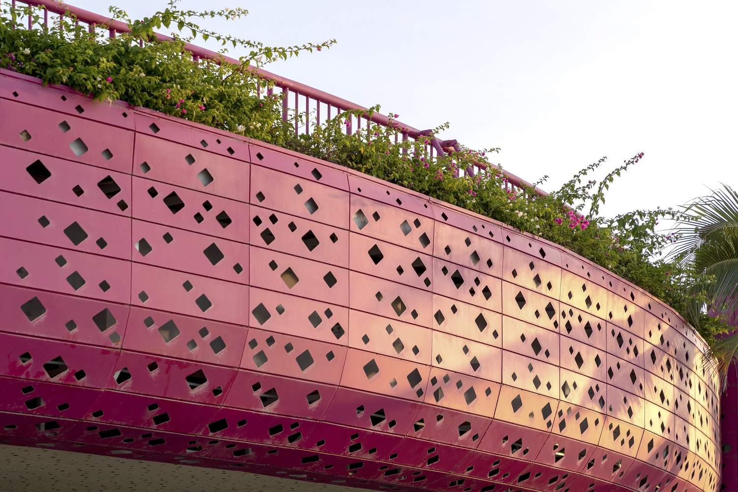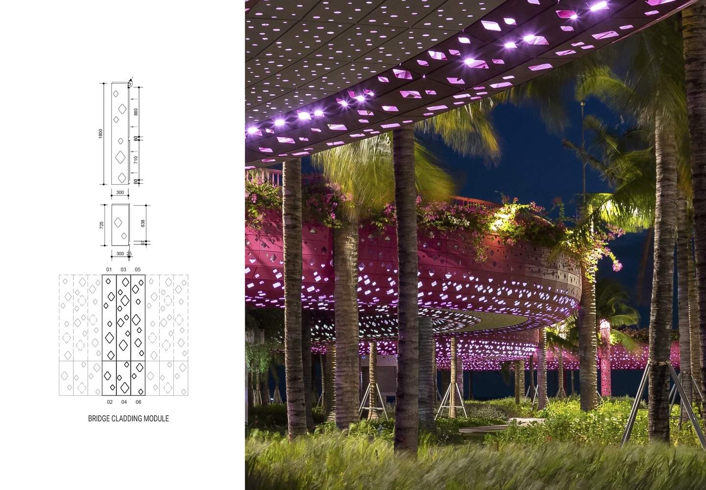 柱廊的空间围合特征结合椰树林间的火龙果色“丝带”,形成了广场。桥的构造柱形似笔直的椰树,人工树皮由纤维混凝土制成,使其与真树融为一体。桥(丝带)和柱(椰林)的叠加,强调了一种理念:火龙果色丝带是一条飘在空中的游步道,蜿蜒于椰树树冠之中,创造了一个上下体验椰树、优化海湾视野的空间。我们通常只能在椰树树冠下行走,且只有自下而上的视角。然而青龙湾廊道让你可以从上面触摸和感受椰子树叶。