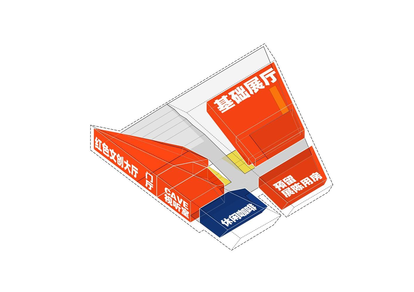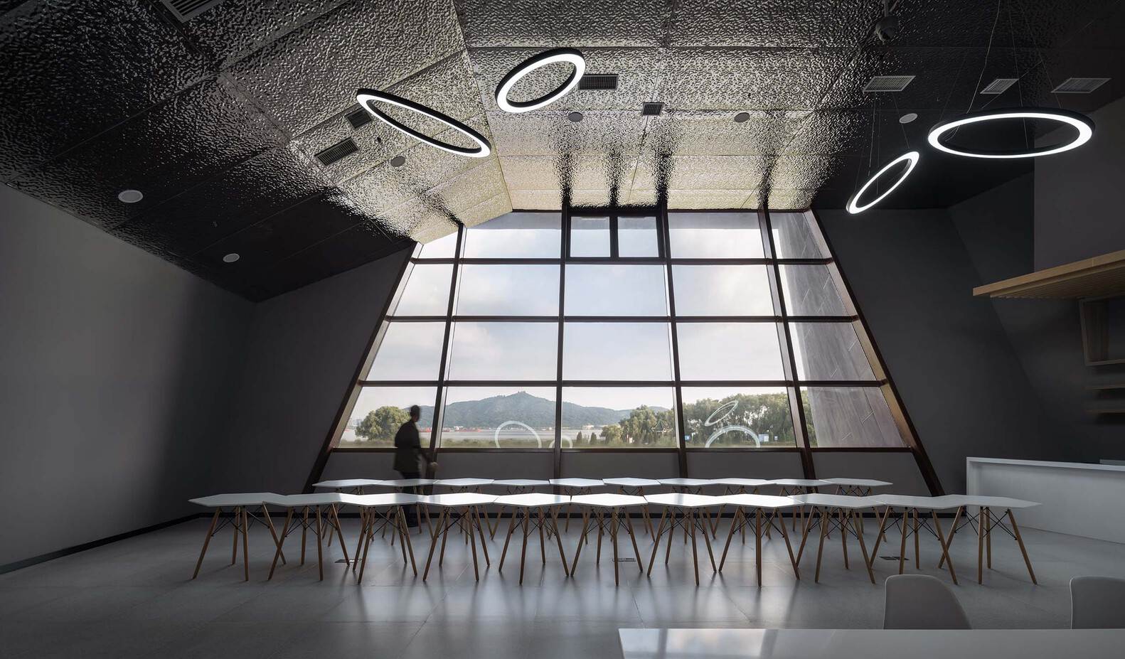 When visitors enter the memorial hall, they are first presented with a tall lobby/foyer under a giant triangular skylight; then they enter the basic exhibition hall to experience the creation of a real historical scene under the firelight of war; stepping onto the red culture exhibition hall on the cantilevered second floor, they can overlook Qixia Mountain and the Yangtze River from here; next, passing through the second-floor corridor, is the virtual experience interactive exhibition hall, which is the end of the exhibition; coming out of the first-floor lobby, circling to the underside of the cantilever, Qixia Mountain in the distance sits on the thin river surface, and the sunset glow shines through the gaps of the cantilever onto the gravel on the ground. From brilliance, dimness, dawn to brightness, visitors here experience the temporal narrative of preparation, river crossing, victory, and commemoration.