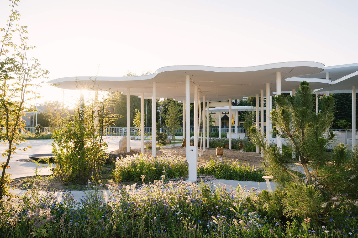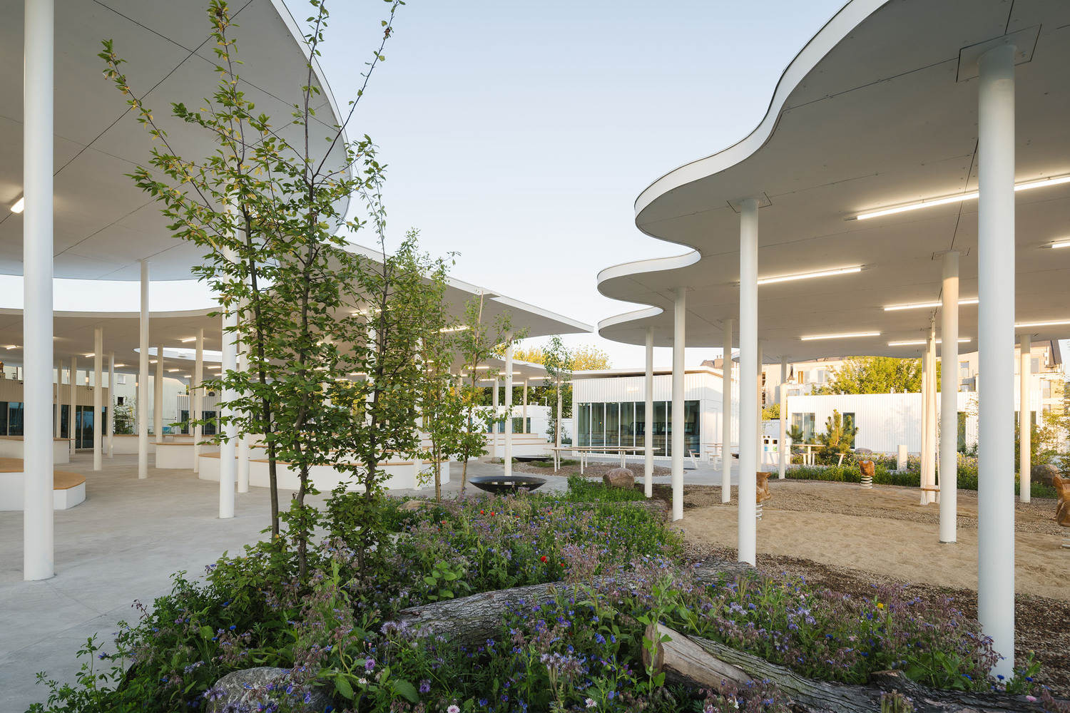 Various street fixtures embellish the final design, such as white circular information boards, bicycle racks, boulders, bird and insect houses, and communal tables and chairs. Under the distinctive organic roof, there is also a play garden with rocking chairs shaped like wooden animals.