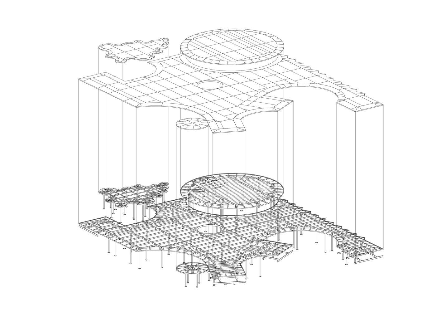 重建项目包括创建一个结合两种社会功能(公园和集市)的混合公共空间。多功能的白色屋顶可以反射光线及挡雨。收市后,带有木台面的阶梯式商户展示台可用作座位和自发聚会的空间。在屋顶外围之下,外立面覆盖着白色波纹板的商店和服务亭设有落地窗门面。