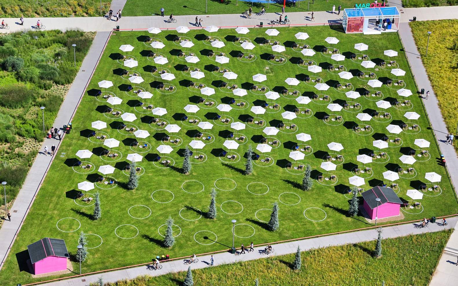 Once the tree circles mature, their dense foliage will form canopies, turning into “plant pavilions” equipped with various facilities for sports, games, and leisure; the spatial structure provides shade for multiple uses. Straight paths cut across the park, connecting the landscape nodes and surrounding areas, creating a multi-centered grid system.