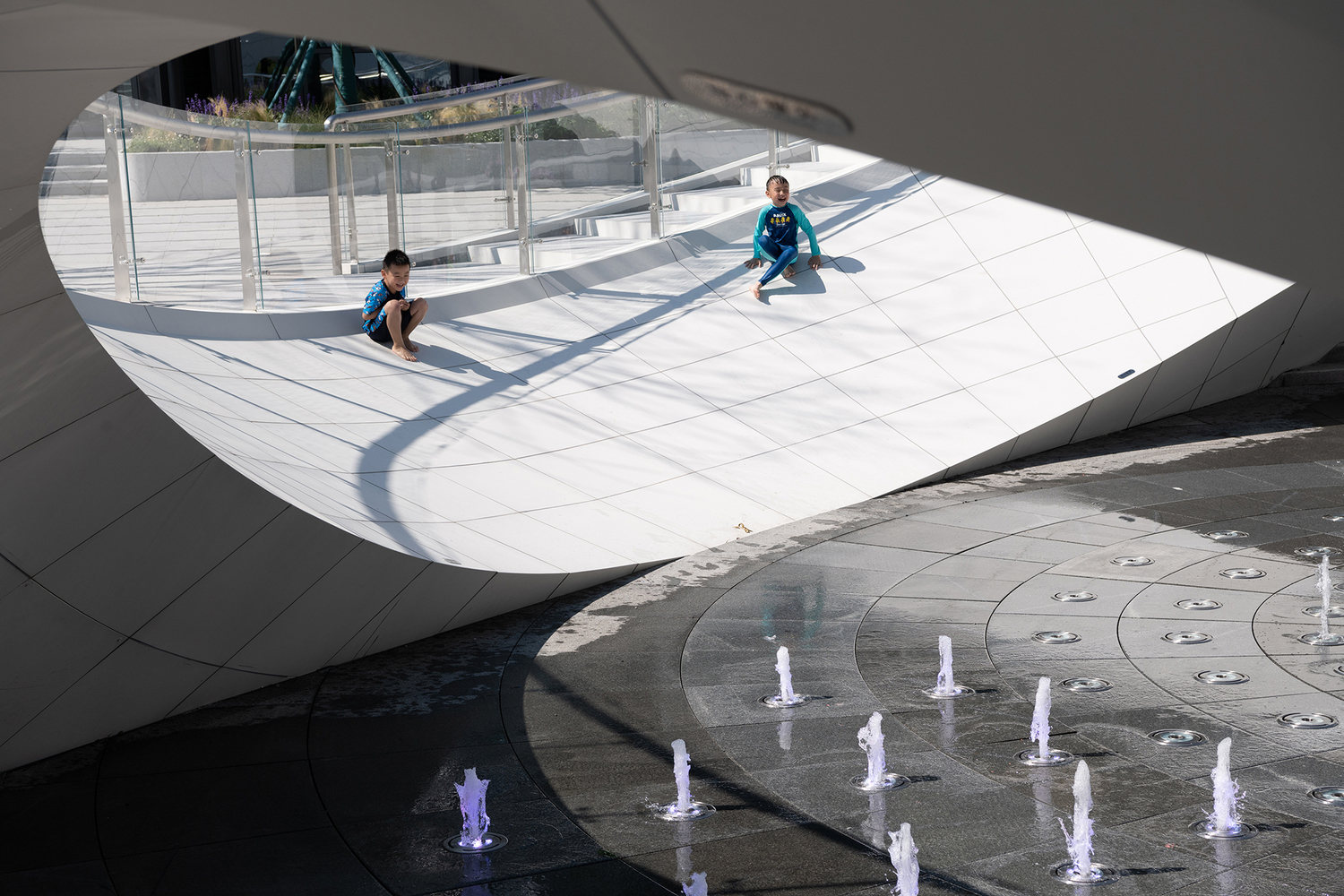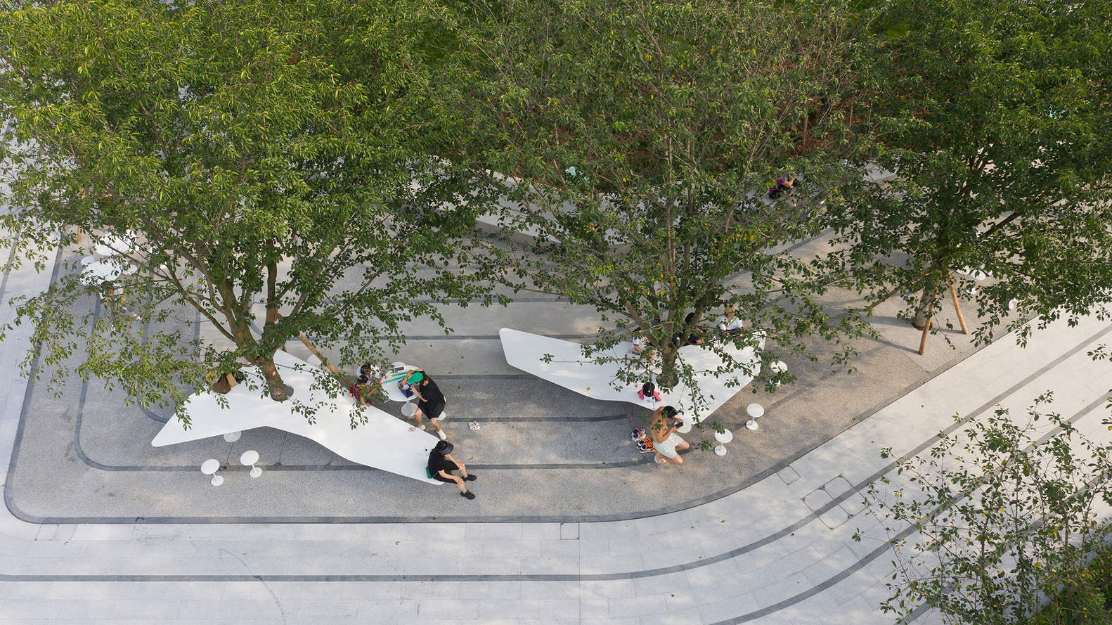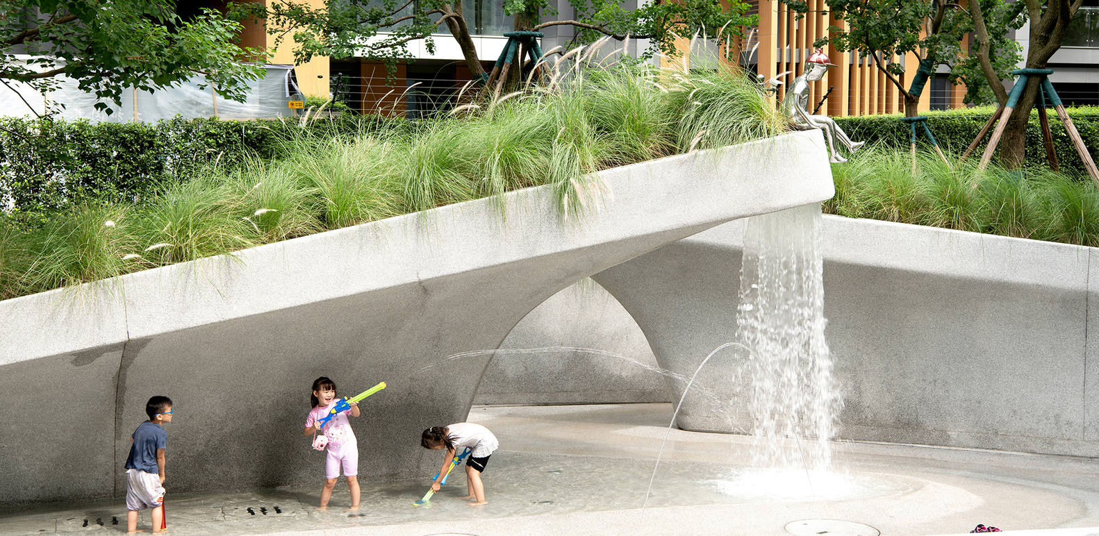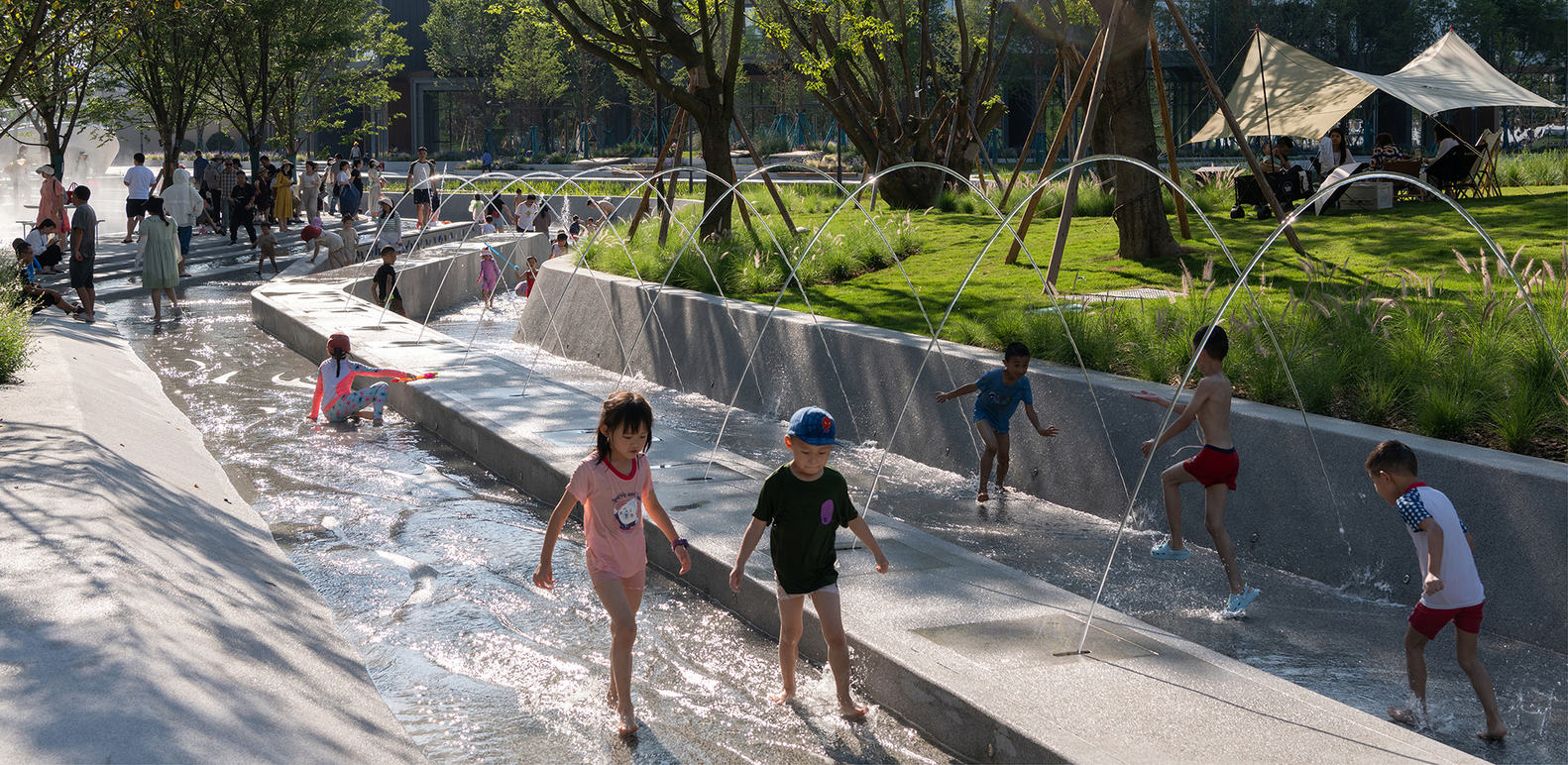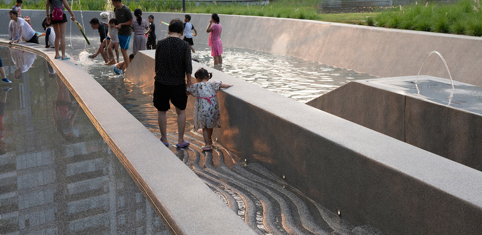 The design introduced water into the site, connecting the originally elongated four plots with a continuous water system, allowing them to converse with each other. All pathways, plazas, and spaces unfolded along this water system, forming a city-scale linear park system where water is the protagonist. Canyons, waterfalls, canals, shallows, and reefs—the design draws inspiration from natural rivers and expresses it through abstract design language, creating different topographies and carving out distinct textures, resulting in dozens of different ways to interact with water and creating rich waterscape spaces.