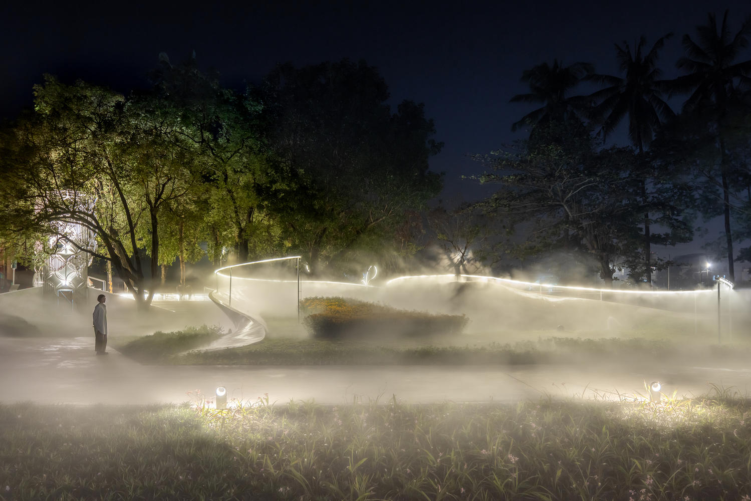 One of our focuses in this project was to develop an irrigation facility where aesthetics and leisure coexist. During the initial three months of the project, we investigated the wind direction and environmental conditions of the site. We collaborated with local suppliers to develop new irrigation facilities to achieve two purposes—1. Provide sufficient moisture for the plants, and 2. Create a misty scene inspired by mountain fog. The fog generation facilities, combined with the lighting system, also ensure safety at night.