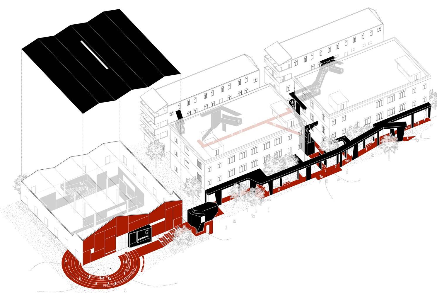Facing the mutually isolated old factories and residential buildings scattered on the north and south sides of the main street, the architects proposed to establish a central main axis of public space with limited renovation funds, allowing existing buildings of different materials and scales to connect and dialogue. A corridor, integrating the material memories of both red brick and black steel, begins at the park entrance, connecting the entrances of the three main exhibition halls. Parking previously along the main street was centralized on the west side of the park, freeing up public space for pedestrian visitors and achieving separation of people and vehicles.
