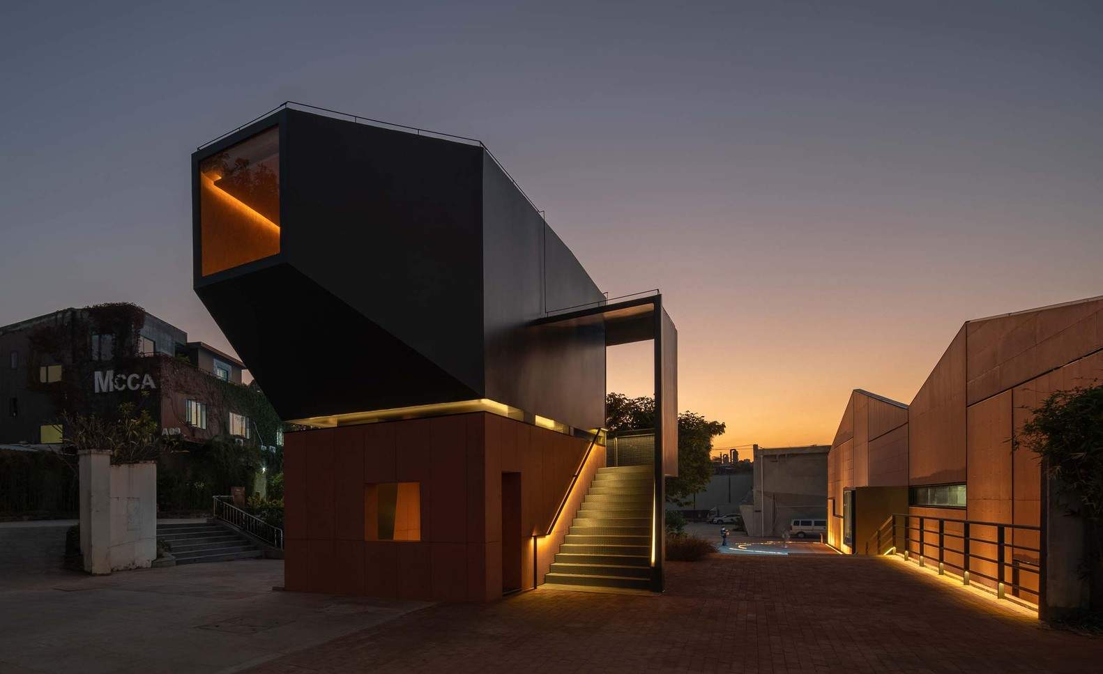 保安室的原有骨骼——墙体、门洞与窗户被保留下来,并以红色水泥纤维板进行包裹。而二层的艺术空间则以钢结构形式从其内部生长出来。新增结构与首层老墙之间留有 20 公分距离,允许光线从新旧时间的缝隙里投射出来。