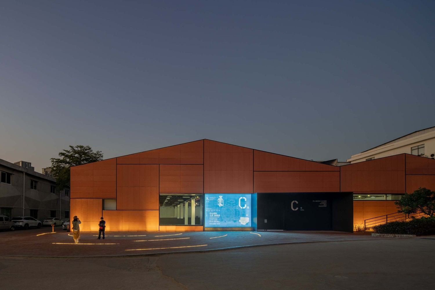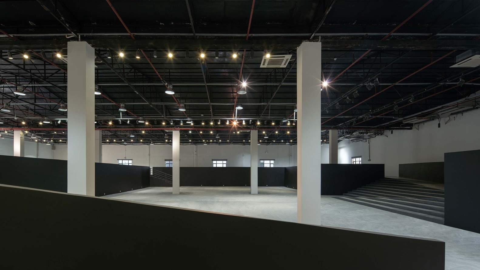 主场馆的外立面改造延续了红与黑相互嵌套的叙述,呼应厂房原有的坡形山墙屋顶与不远处的群山,形成了一座抽象线条构成的几何山丘。主场馆内部有 1000 平米的使用面积,但桁架下净空高度仅有 3 米,严重不足以满足当代艺术展览的使用需求。在非常有限的工程预算条件下,建筑师与刘晓都馆长及施工团队经过几次讨论之后,最终决定放弃了最初设想整体抬升主展馆桁架屋顶的计划,改为在展馆中心下挖 1.5 米,以最小成本改造出了高净空展厅。