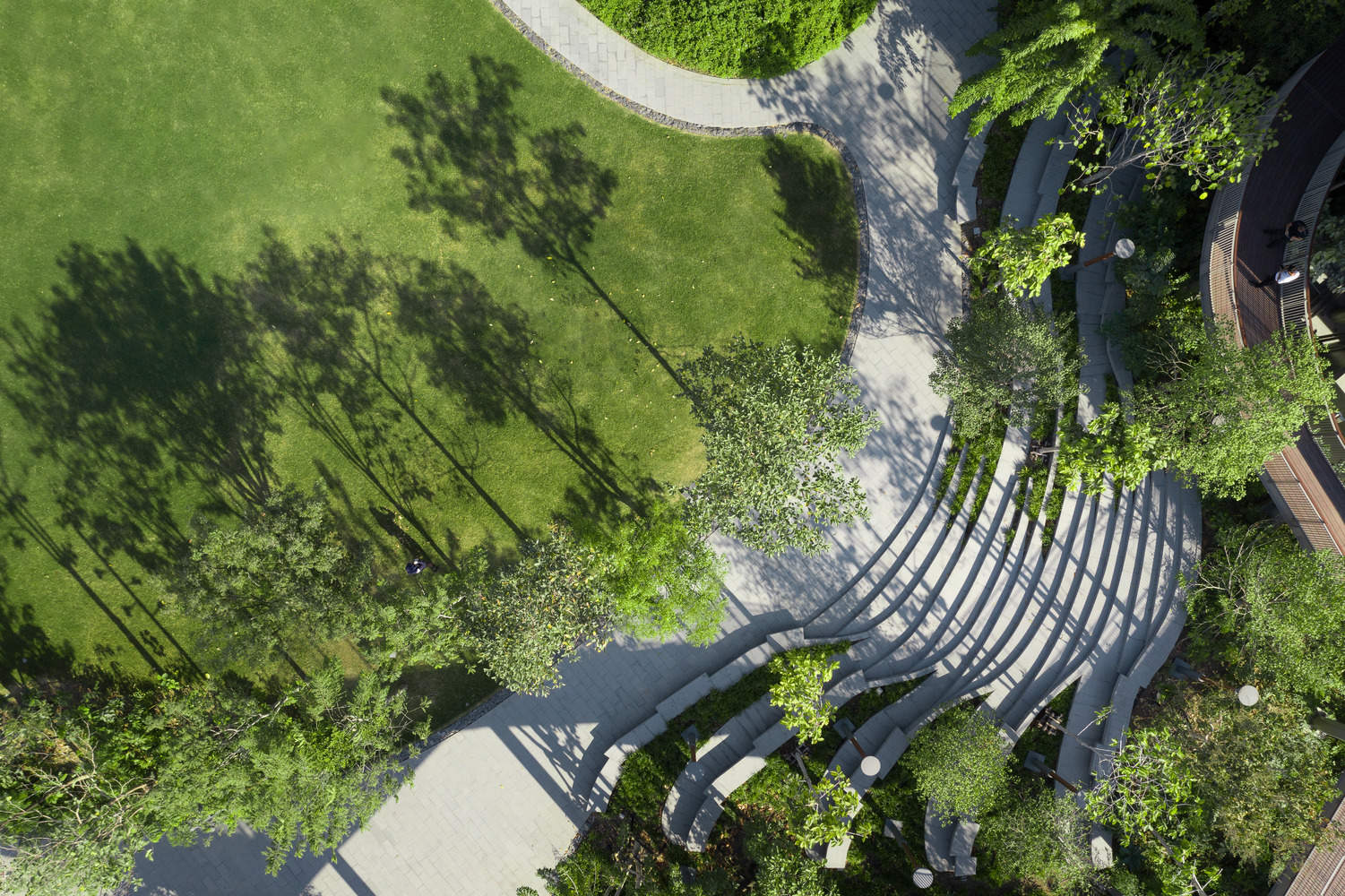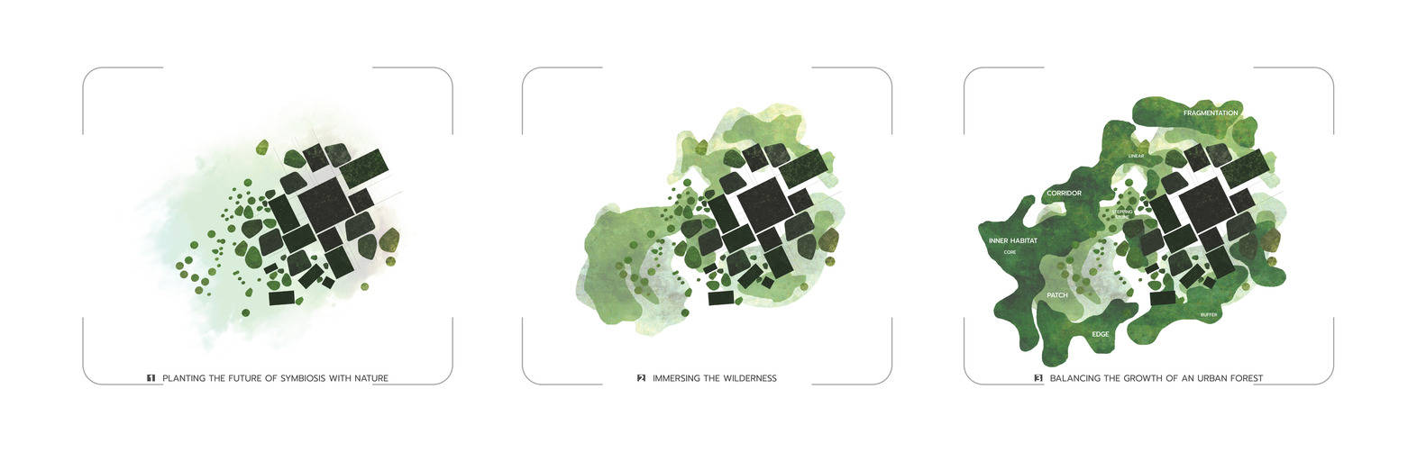 景观概念是“与自然共生”,包含三个目标:种植与自然共生的未来,沉浸在荒野中,平衡人类活动和城市森林的增长。为实现这些目标,建筑师将僵硬死板的亭子形式转化为中央森林般的自由形态,最大限度地为所有用户和居民提供隐私,提供在森林中生活的真实体验,并提供与自然相处的快乐。森林展亭旨在成为一个与自然共生的试验室,所以将自然的精华与景观设计融为一体,使用者可以在城市化的形式中获得独特的自然体验。此外,令人愉悦的人行道和空中走廊的设计,吸引人们到户外去,让人们在宁静如画的景观中享受自然环境的质量。