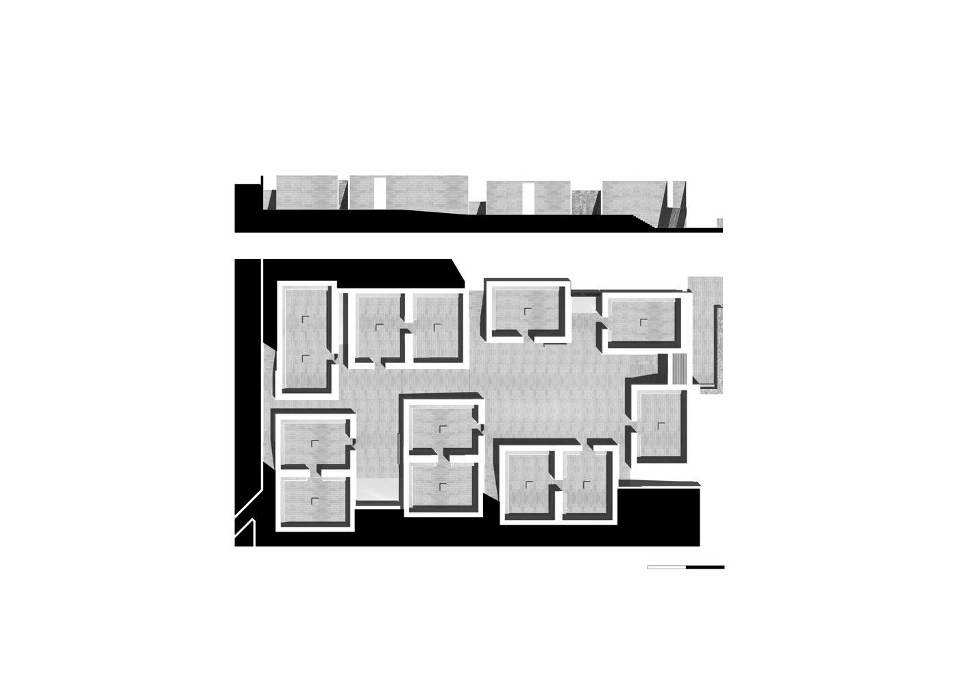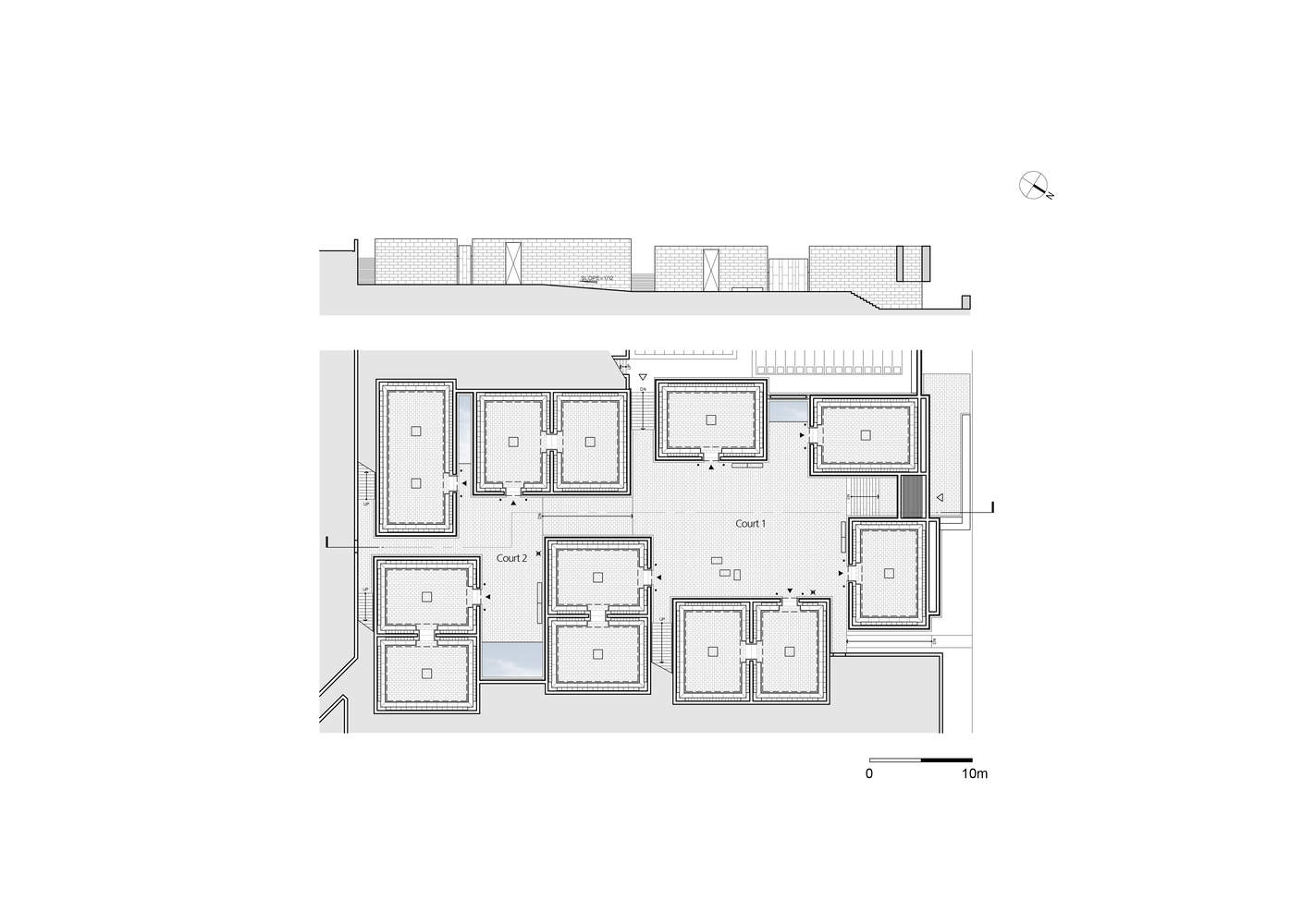 This project is located in the center of the cemetery and is an outdoor ossuary surrounded by small tomb clusters. Eight structures housing ashes are situated between two courtyards to help people adapt to observation and relaxation. By using unfamiliar imported stone to create a familiar scale space, it aims to create an impression that is both intimate and alien.