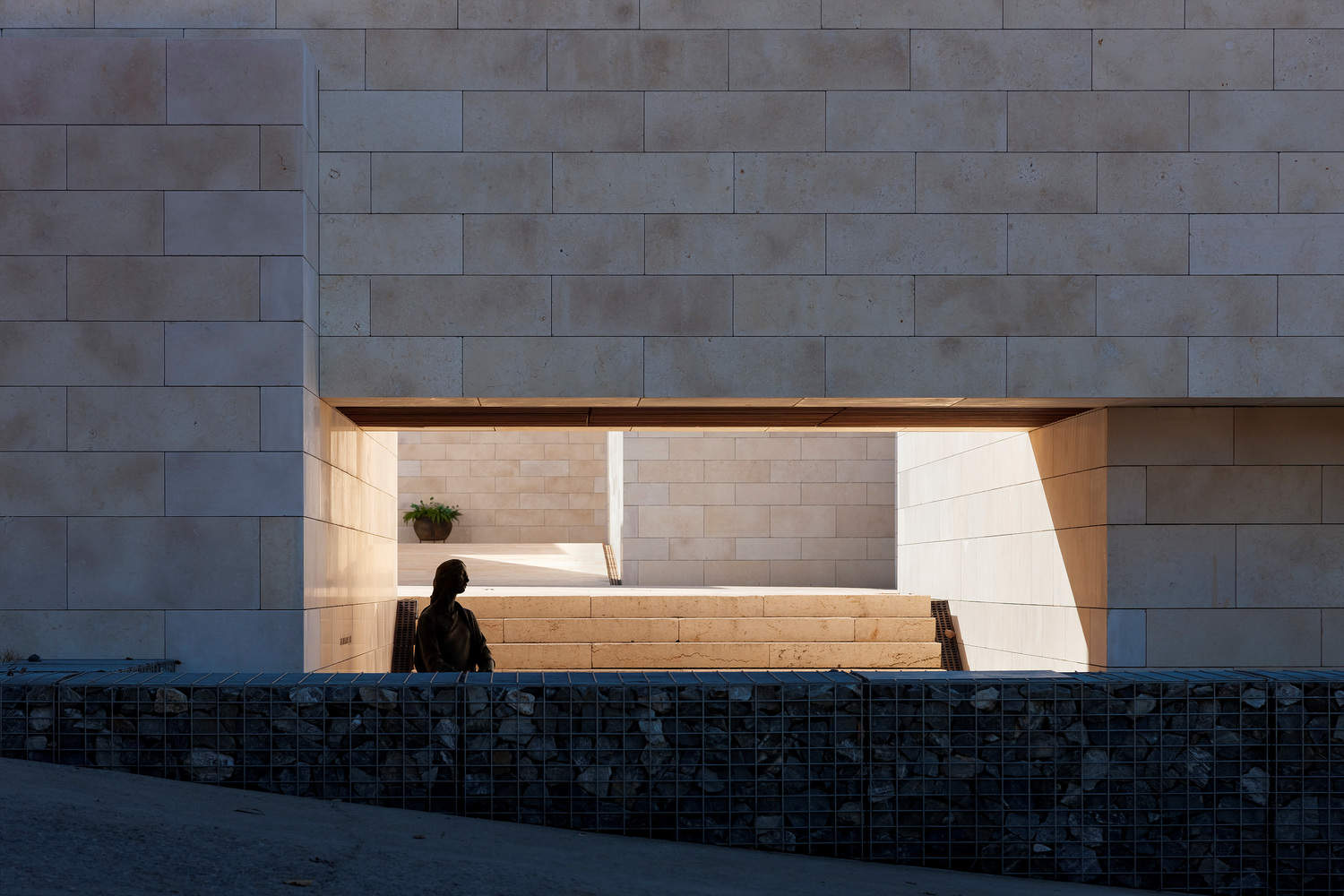尺度与材料的张力构建:建筑选址于公墓中心,通过将8个骨灰存放结构巧妙地置于两个院落之间,有效地平衡了公共瞻仰与个人沉思的需求。设计语言上,采用“陌生的进口石材”来营造“熟悉的规模空间”,这种材质的陌生感与尺度的人性化之间的张力,成功地塑造出一种“亲密却生疏”的复杂情感印象。此外,设计通过墙体将外部自然环境与内部空间进行隔离,反而突出了对天空、风和水这些基本元素的直接感知,确保了记忆唤醒的空间真实性。