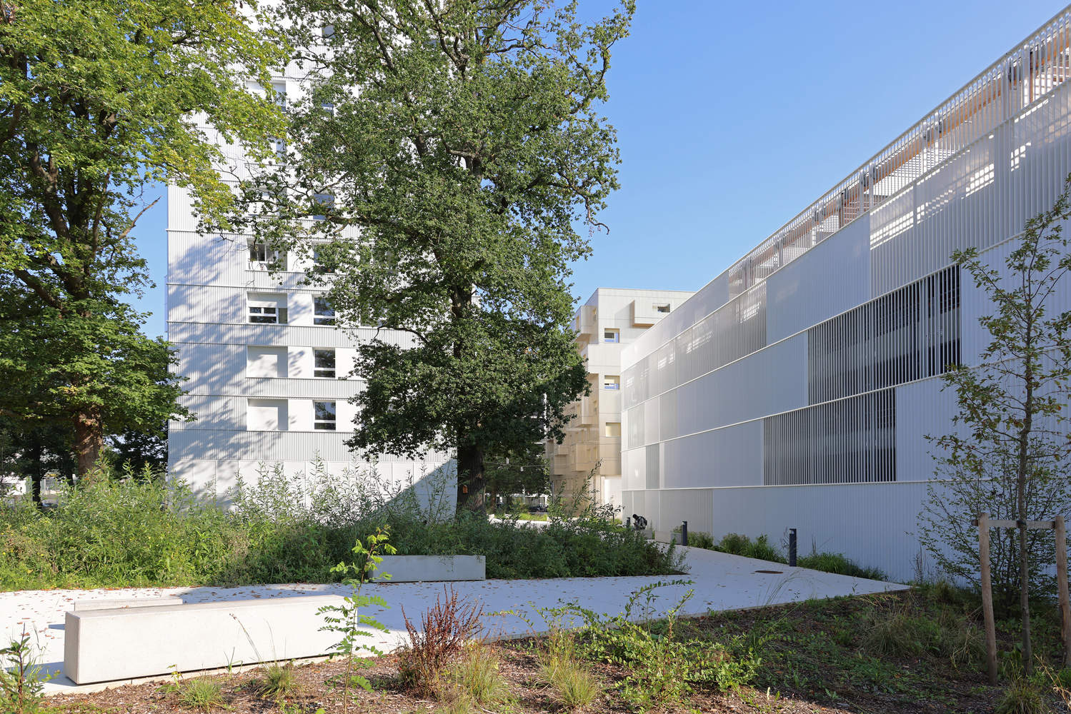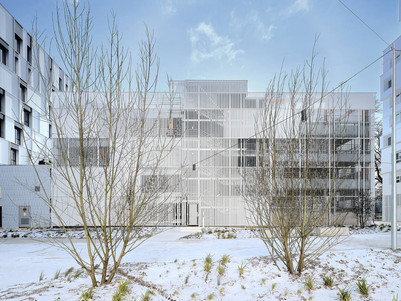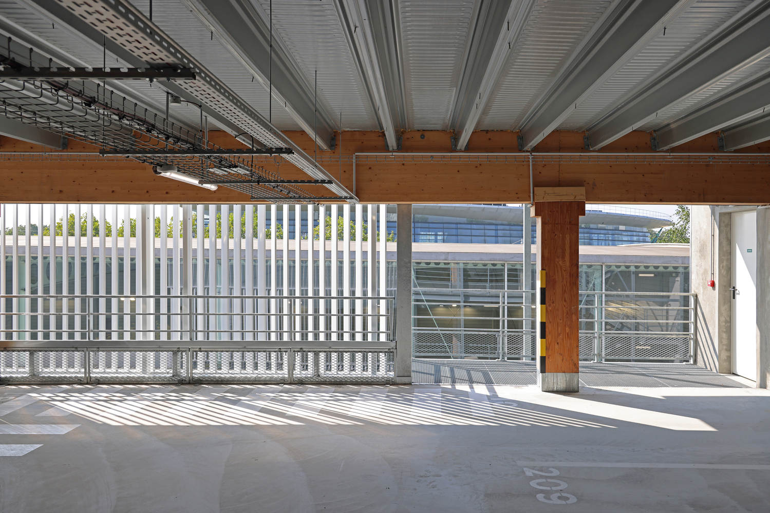 The structure of the car park combines wood and concrete. The ground floor is entirely concrete, from the columns to the beams and the slabs; from R+1 onwards, the columns and beams are made of wood, while the slabs are concrete. The cladding, made of vertical metal tubes with a white lacquered finish, responds to two major challenges: ensuring good natural ventilation for the car park; protecting the surroundings from the impact of parked vehicles. The variation in the tubes' positions creates a dynamic effect, offering a different perception of the building as you move.