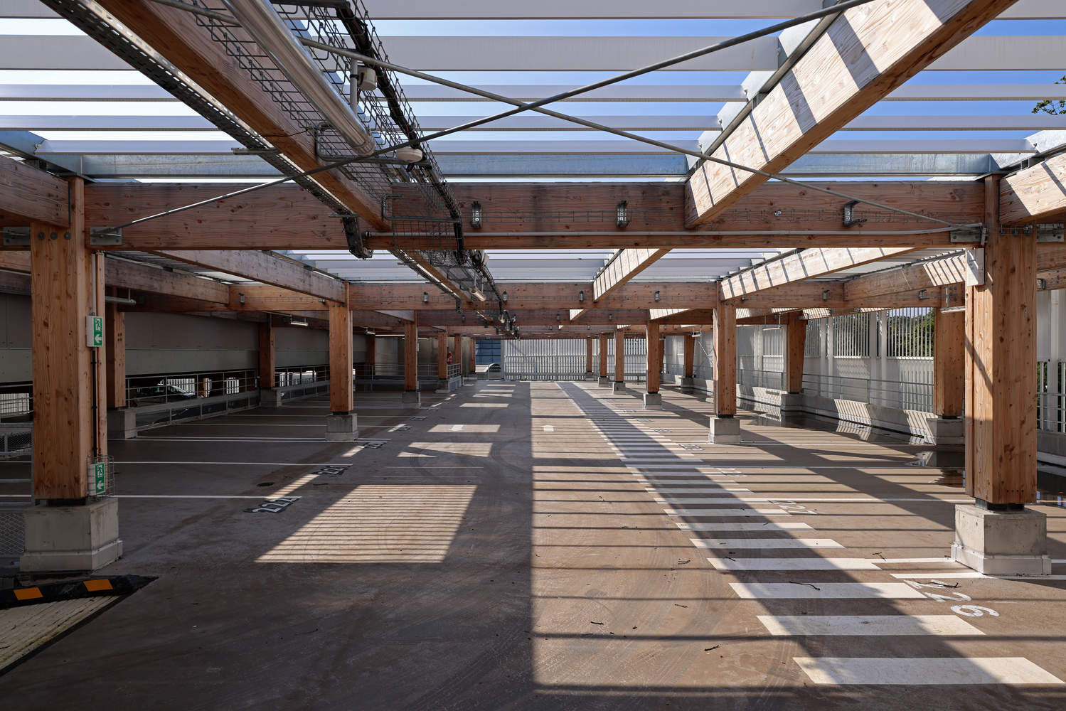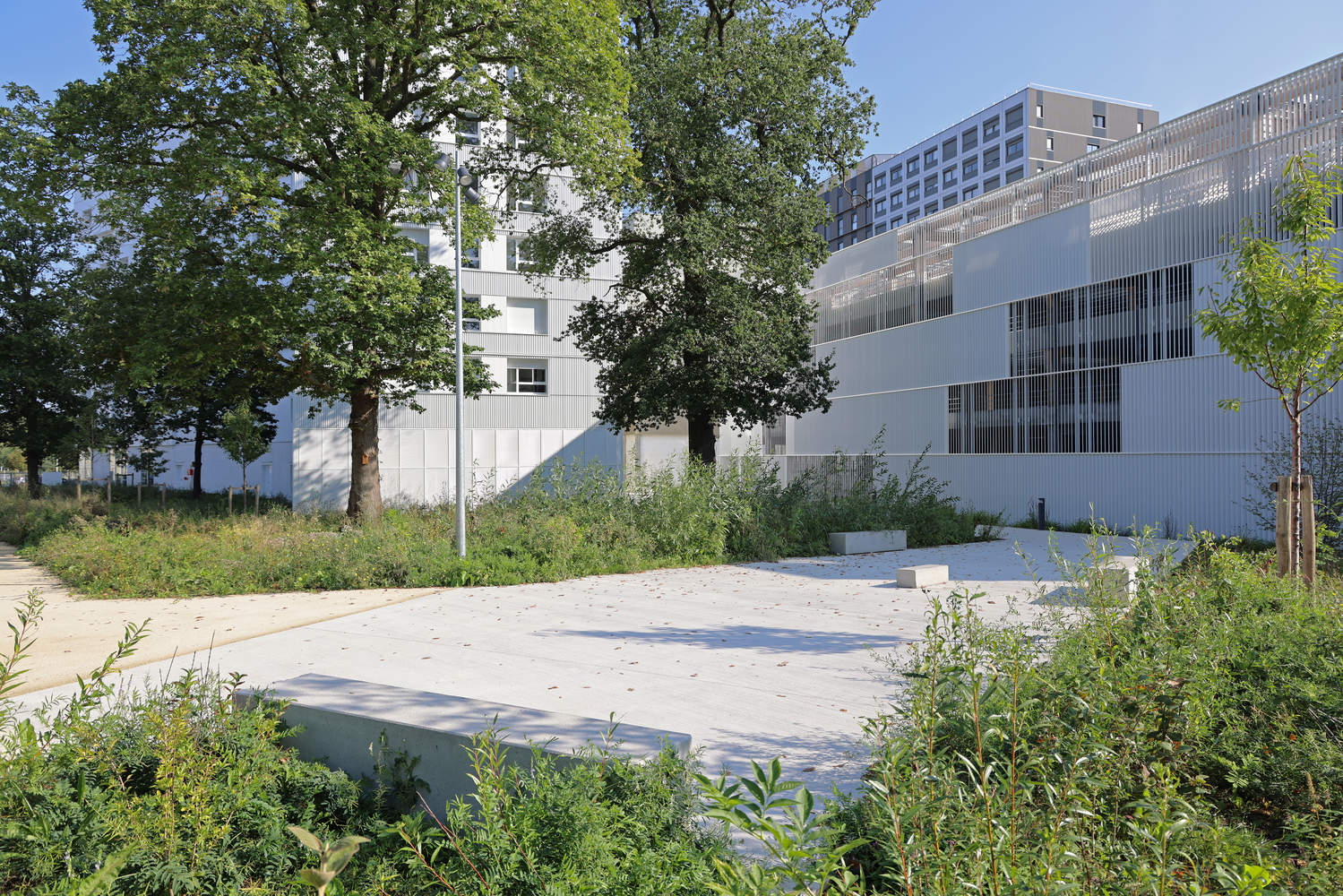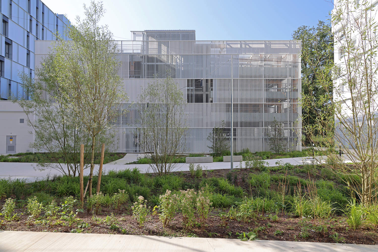 The structure of the car park combines wood and concrete. The ground floor is entirely concrete, from the columns to the beams and the slabs; from R+1 onwards, the columns and beams are made of wood, while the slabs are concrete. The cladding, made of vertical metal tubes with a white lacquered finish, responds to two major challenges: ensuring good natural ventilation for the car park; protecting the surroundings from the impact of parked vehicles. The variation in the tubes' positions creates a dynamic effect, offering a different perception of the building as you move.