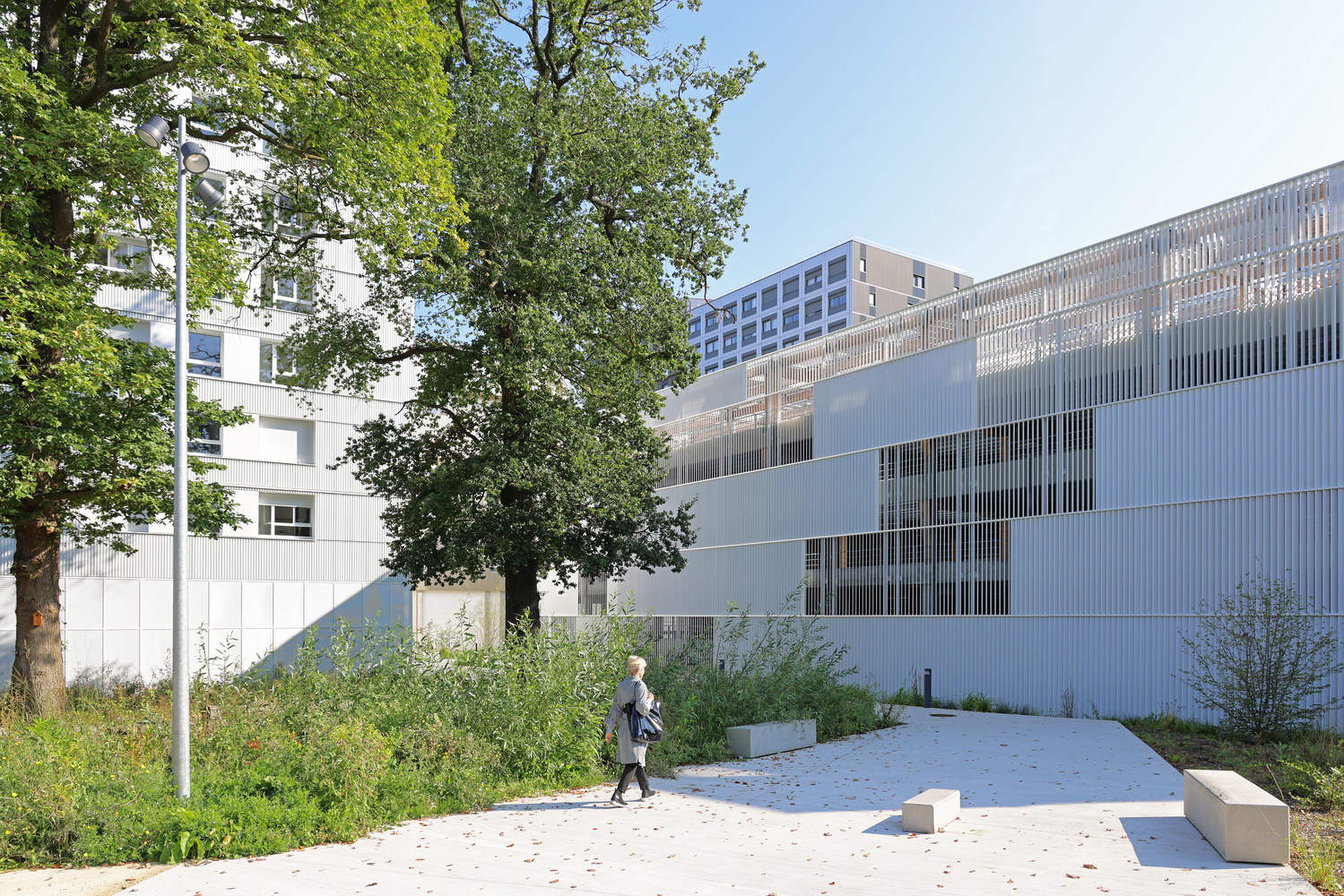 停车场的结构结合了木材和混凝土。底层从柱子、梁到楼板全部是混凝土;从 R+1 开始,柱子和横梁由木头制成,而楼板由混凝土制成。覆层采用白色漆面垂直金属管包裹,以应对两大挑战:确保停车场良好的自然通风;保护周围环境免受车辆停放的影响。管子位置的变化会有一种动感的效果,使你在移动时对建筑物产生不同的感知。