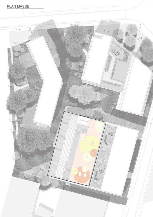 Treed it is a landscape block of 5 buildings: three housing units for students and young workers, a medical office, and a car park with 240 spaces, structured in wood and concrete. The site plan aims to preserve the large oak trees existing on the plot.
