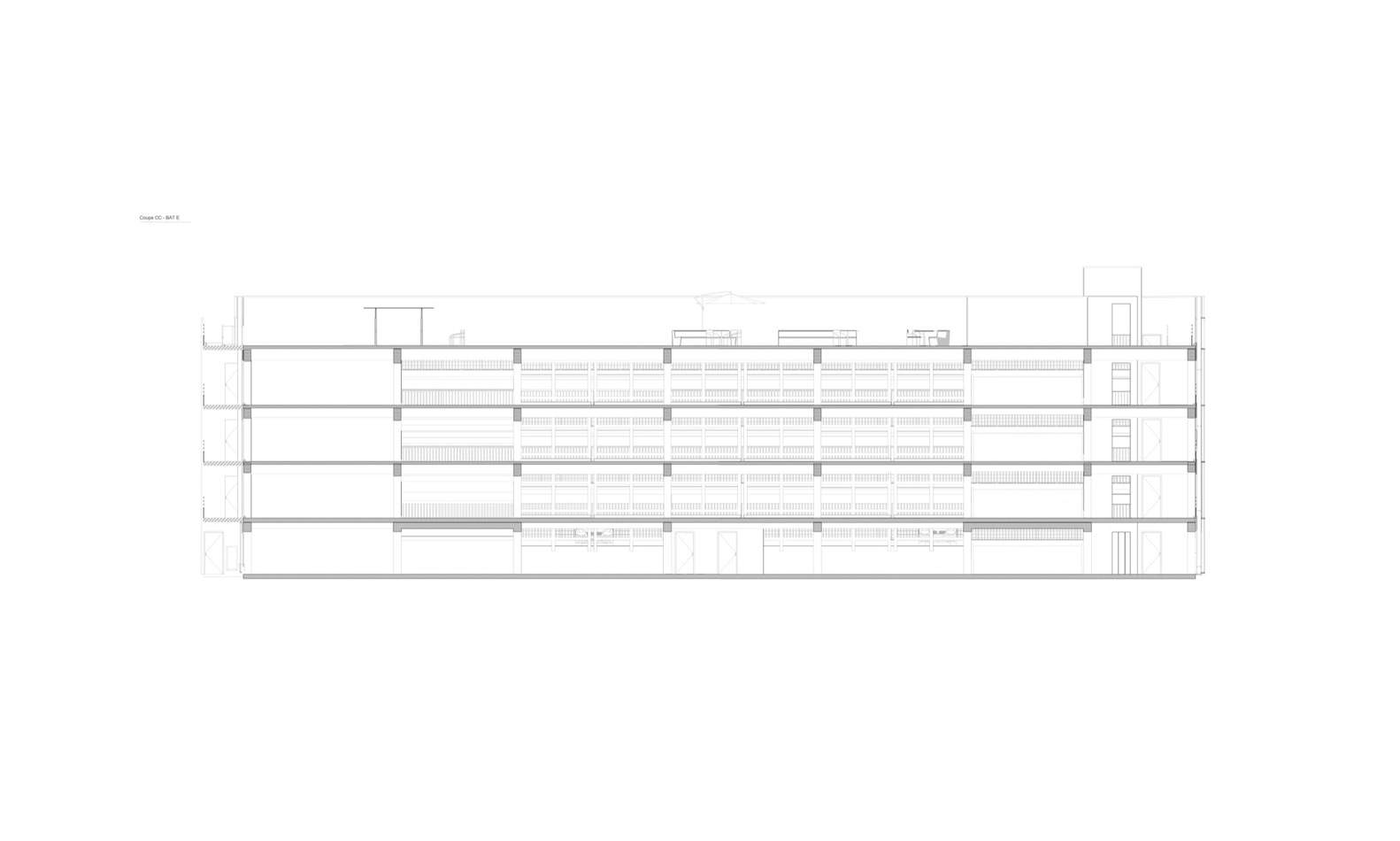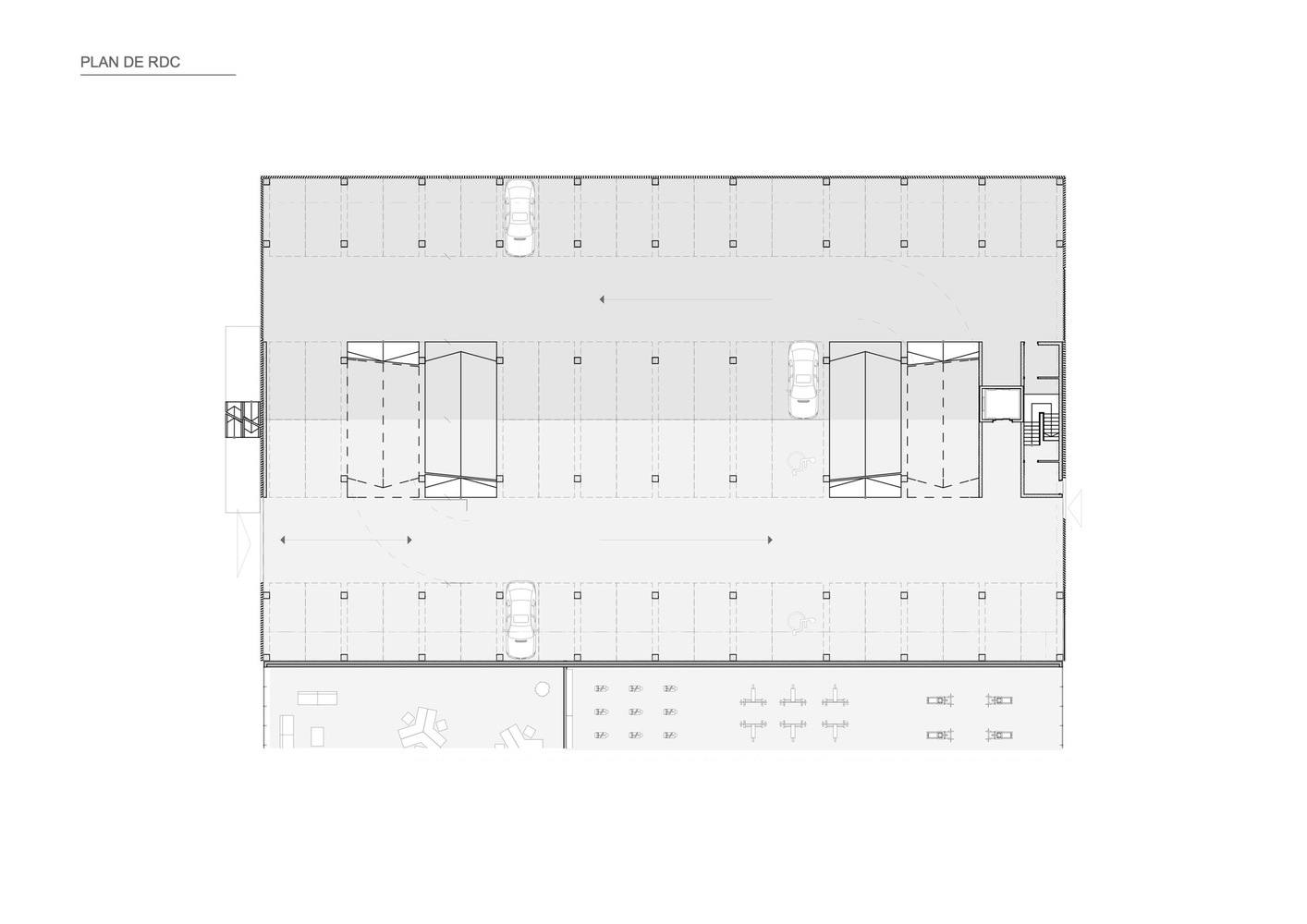 To limit the space occupied by traffic ramps and increase the number of parking spaces, the car park is organized in half-levels. The last half-level is inaccessible to cars and has been transformed into a playful sports area accessible to all residents, featuring a ping-pong table and a fitness trail.