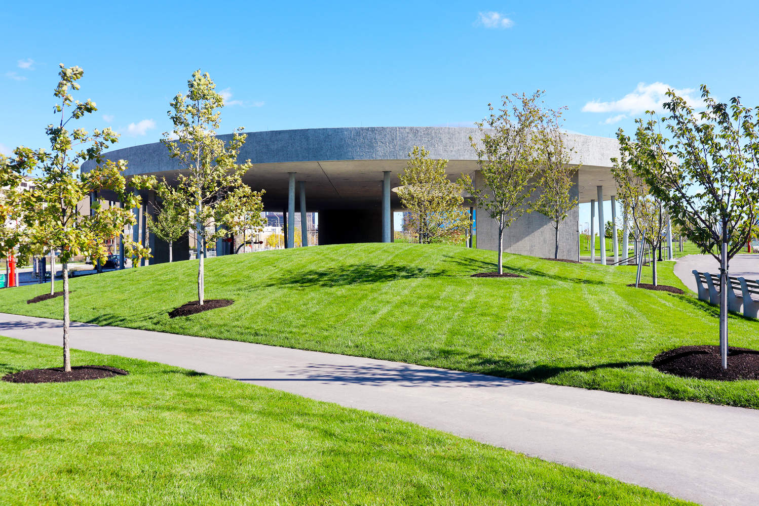 Adjaye Associates’ architectural design establishes the park’s identity as a vital piece of urban public space. The William Davidson Sport House is a striking structure featuring a full-size basketball court beneath a sculptural concrete canopy, offering year-round recreation and shelter. Two comfort stations, also designed by Adjaye Associates, provide restrooms and flexible community spaces. The main pavilion utilizes an adaptable enclosure system that can transition between open-air and enclosed configurations depending on the season and activity needs.
