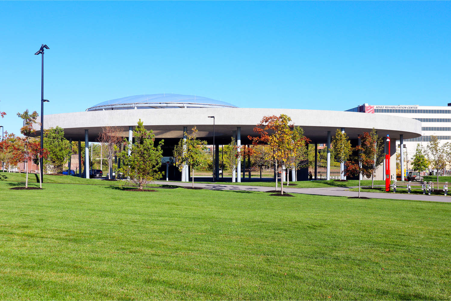 Together, these designs establish Ralph C. Wilson, Jr. Centennial Park as a significant public destination, creating an inclusive space where Detroit residents can reconnect with the natural beauty of the riverfront. The William Davidson Sport House is a 28,000-square-foot pavilion supported by 33 steel columns beneath a sculptural concrete roof featuring a massive, approximately 2,000-square-foot skylight. Natural light floods this flexible indoor/outdoor pavilion, which houses a full-size Detroit Pistons basketball court for use day and night throughout the year.