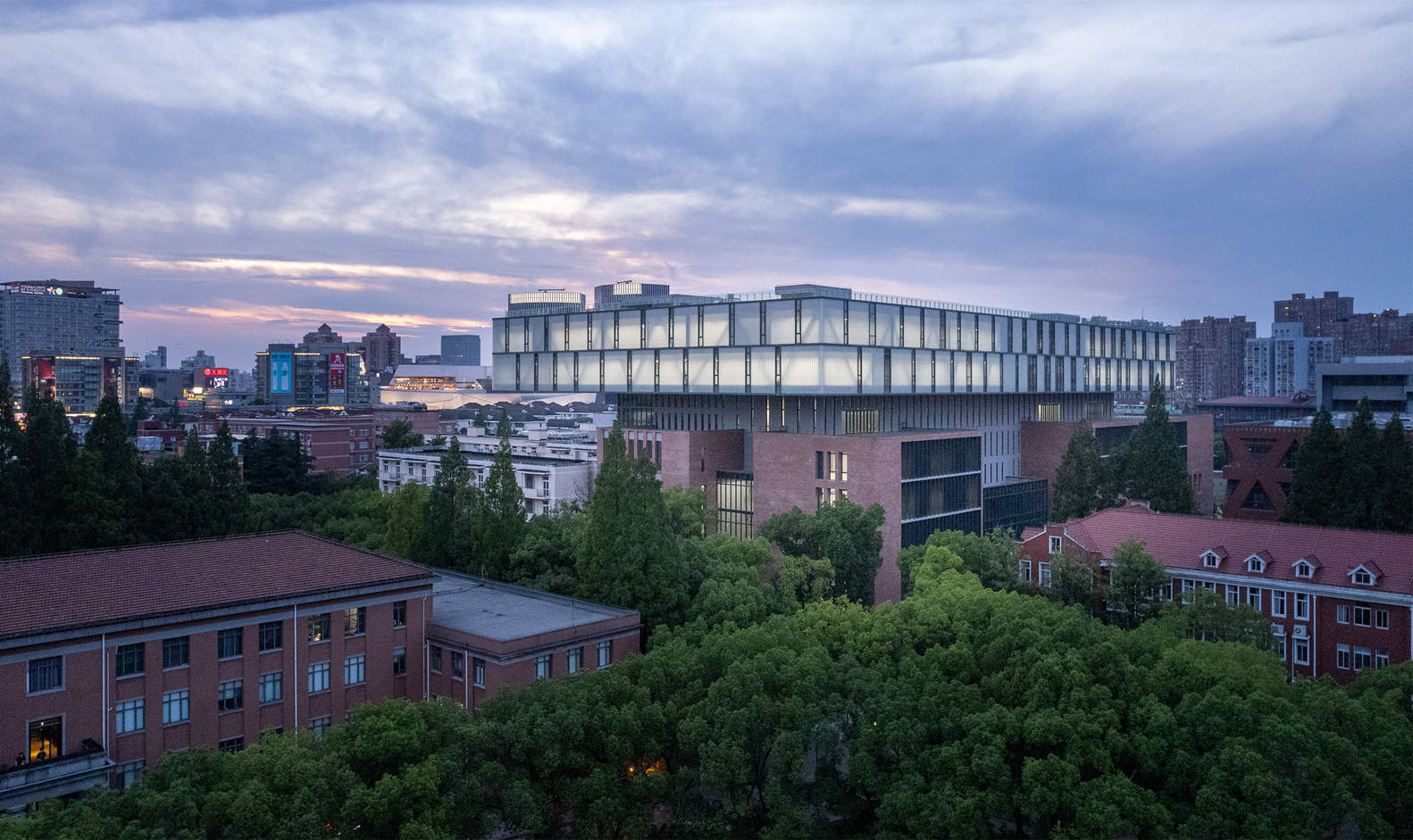 建筑师提供的文字描述。上海大学延长路校区占地19.2公顷,在现有建筑群内进行了新建和翻修。该项目包括艺术学院、电影学院的集群,以及电影制作和文化交流的实验培训基地,形成了一个集研究、教学、实验、培训、展览和交流于一体的综合艺术教育综合体。