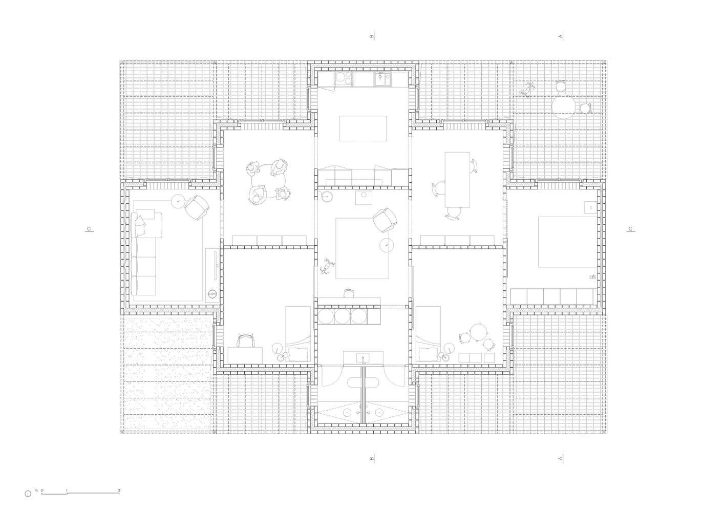 住宅通过与结构网格相呼应的种植凉棚与花园相连,形成了作为气候庇护所的户外空间,鼓励人们与周围的自然环境进行互动。