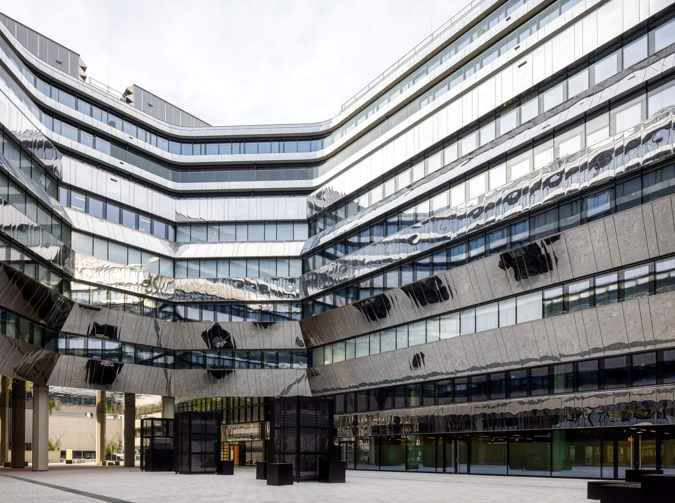 The mirrored cladding was removed from the building's facade. The new stainless steel facade finish, due to its fine embossing, presents a glare-free, silky-matte appearance, while terraces create additional open spaces for restaurants and offices, contrasting with the building's previous enclosure. Another planning focus was designing a lively base area. The extensive opening of the base allows for an ideal spatial relationship with Julius-Tandler-Platz, making the station hall more inviting and creating pleasant connections to the central square level. Behind the building on the north side, a 1970s connecting structure (between the office complex and the garage) was removed to return to Karl Schwanzer's original concept of an isolated cubic building.