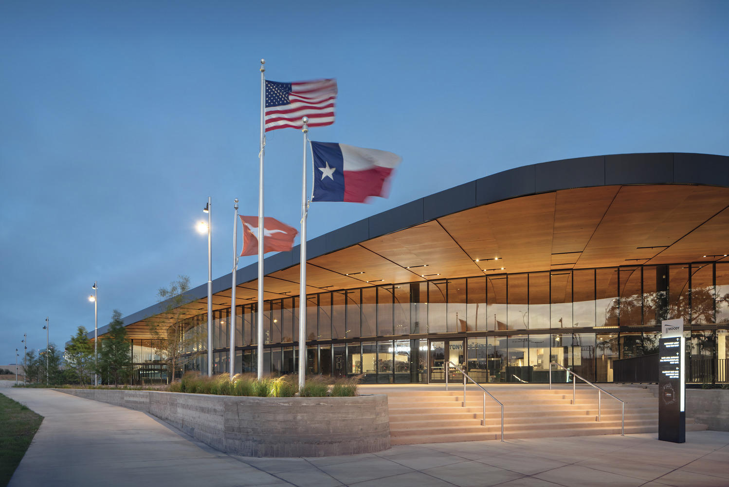 穆迪中心篮球和活动场馆位于得克萨斯州大学奥斯汀分校,简称“穆迪中心”。从到达互动广场直到落座,这座场馆致力于为球迷创造出一种沉浸式体验。场馆拥有 1.5 万多个座位,总体规划是打造一座将校园所有体育设施连在一起的比赛日广场,并且充当球迷、公众和运动员的集会空间。场馆以互动性作为设计驱动力,将室内外空间融合在一起,创造出极具凝聚力和前瞻性的体验。场馆的设计尊重了校园特色并引入了现代化的系统和细节方法,别出心裁的同时也没有盖过其他校园体育建筑的亮点。它的设计宗旨是打造具有感染力的城市空间,将体育设施与当前和未来的校园发展结合在一起。