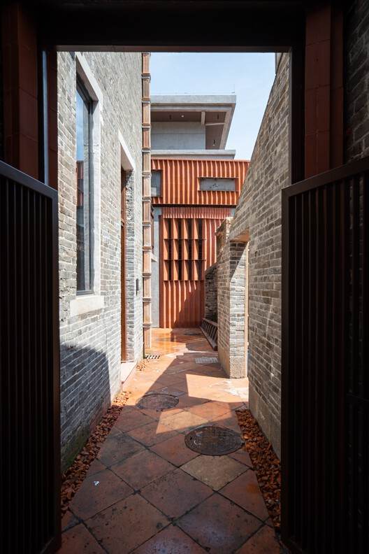 沿街的两幢建筑分别是承担会客功能的 1 号楼珠江纵队队部旧址,以及承担工作室功能的 4 号楼改造民宅,进入内部公共院落需要打开另一个出入口。同时内部院落、院内露台以及屋顶露台共同形成的公共空间系统也需要在沿街面上有所提示。因此,建筑师在建筑群之间置入了一组陶砖加钢架共同构成的新的流线系统,同时也成为“陶”主题再次在官窑复兴的视觉系统。此系统从入口处的砖砌休息座椅区导向连廊区,穿过连廊正对的照壁则是一堵局部镂空的砖砌墙。
